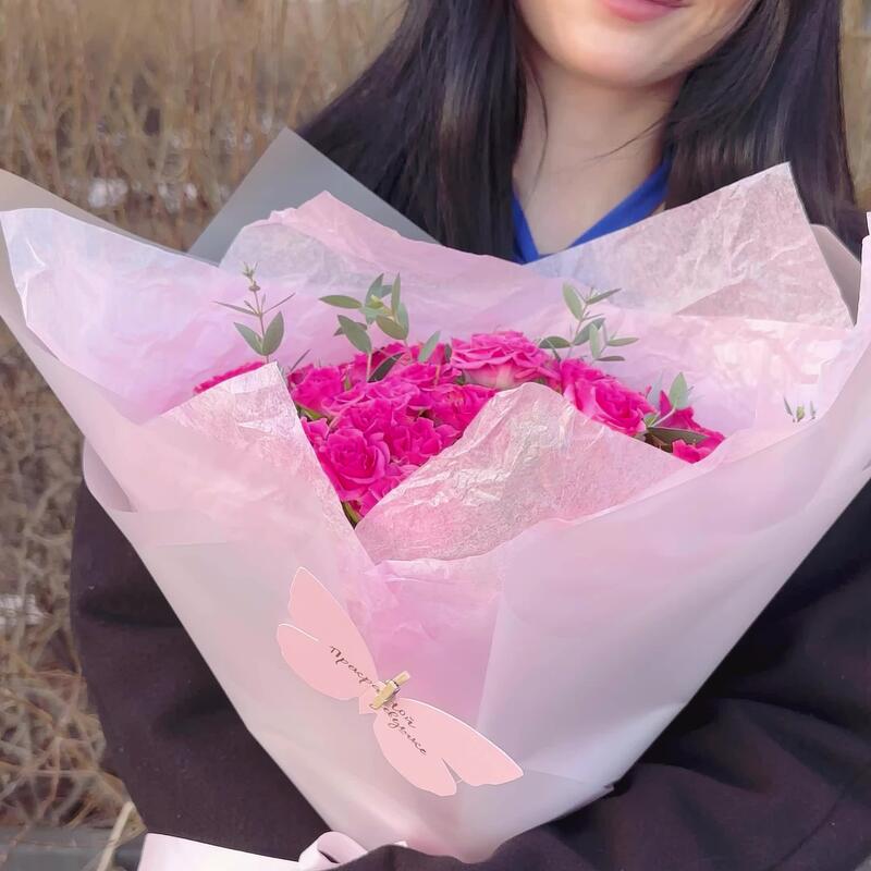 Эвкалипт – 3 шт.Лента атласная – 1 шт.Пленка матовая – 2 шт.Открыточка с вашими пожеланиями – 1 шт.Тишью розовая – 2 шт.