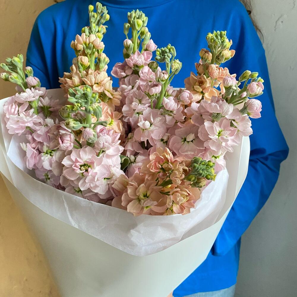Маттиола – 9 шт.Тишью белое – 2 шт.Упаковка дизайнерская – 2 шт.Лента атласная – 2 шт.открытка с вашими пожеланиями – 1 шт.подкормка для срезанных цветов – 1 шт.