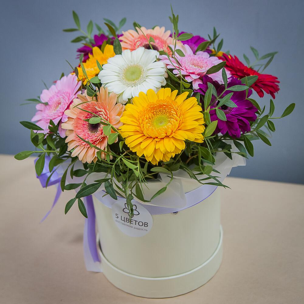 Гербера желтая – 3 шт.Гербера красная – 3 шт.Гербера розовая – 3 шт.Гербера белая – 2 шт.Гербера кремовая – 2 шт.фиолетовая – 2 шт.