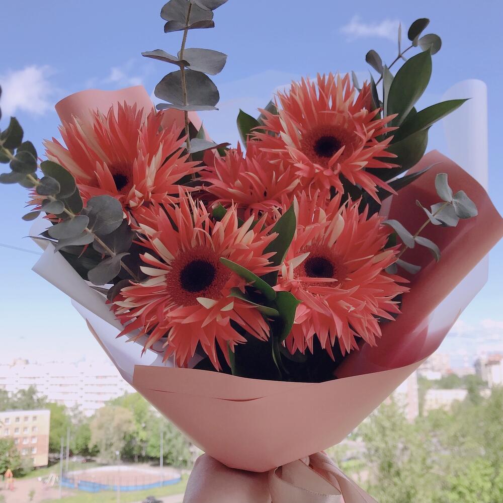 Рускус – 1 шт.Эвкалипт – 1 шт.Лента атласная – 1 шт.Упаковка дизайнерская – 1 шт.инструкция по уходу за цветами – 1 шт.любовь флориста – 1 шт.махровая гербера – 5 шт.витамины для цветов – 1 шт.