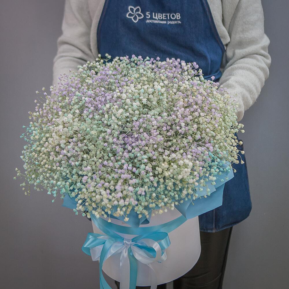 Букет цветов из 15 радужной гипсофилы в шляпной коробке