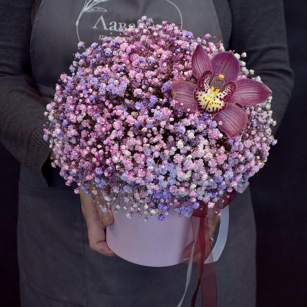 Шляпная коробка – 1 шт.орхидея – 1 шт.гипсофила разноцветная – 9 шт.