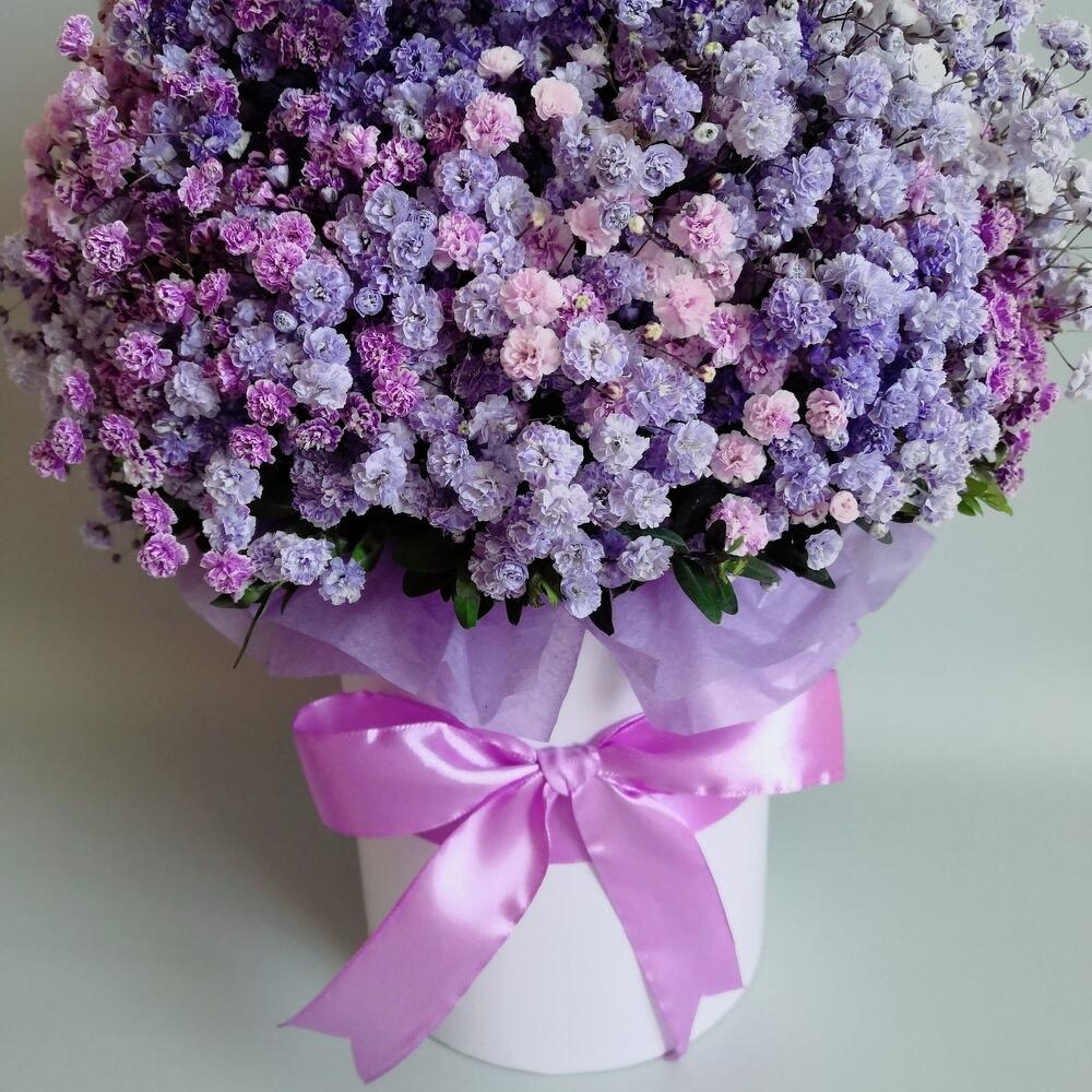 “Сиреневый туман” – композиция из гипсофилы в шляпной коробке