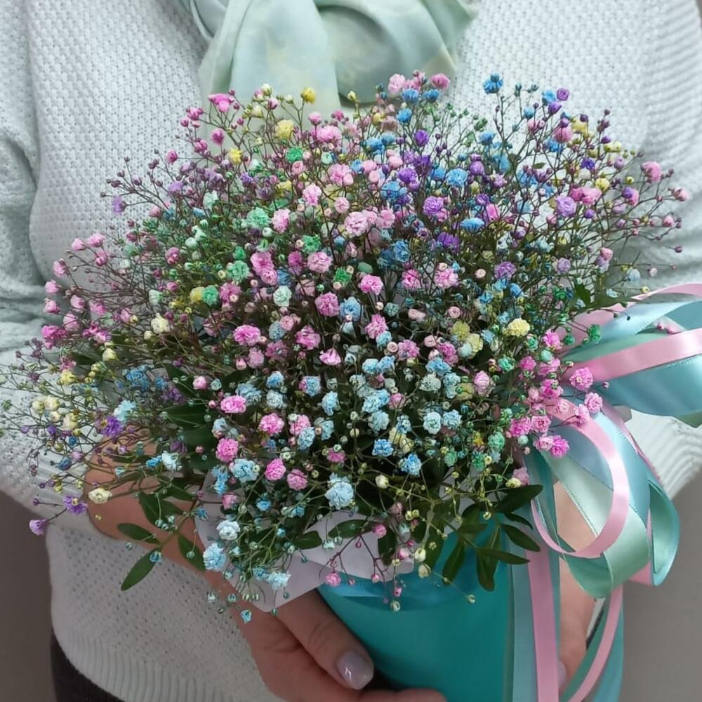 гипсофила радужная – 5 шт.Фисташка – 1 шт.Кашпо – 1 шт.Пленка матовая – 1 шт.Оазис флористический – 1 шт.