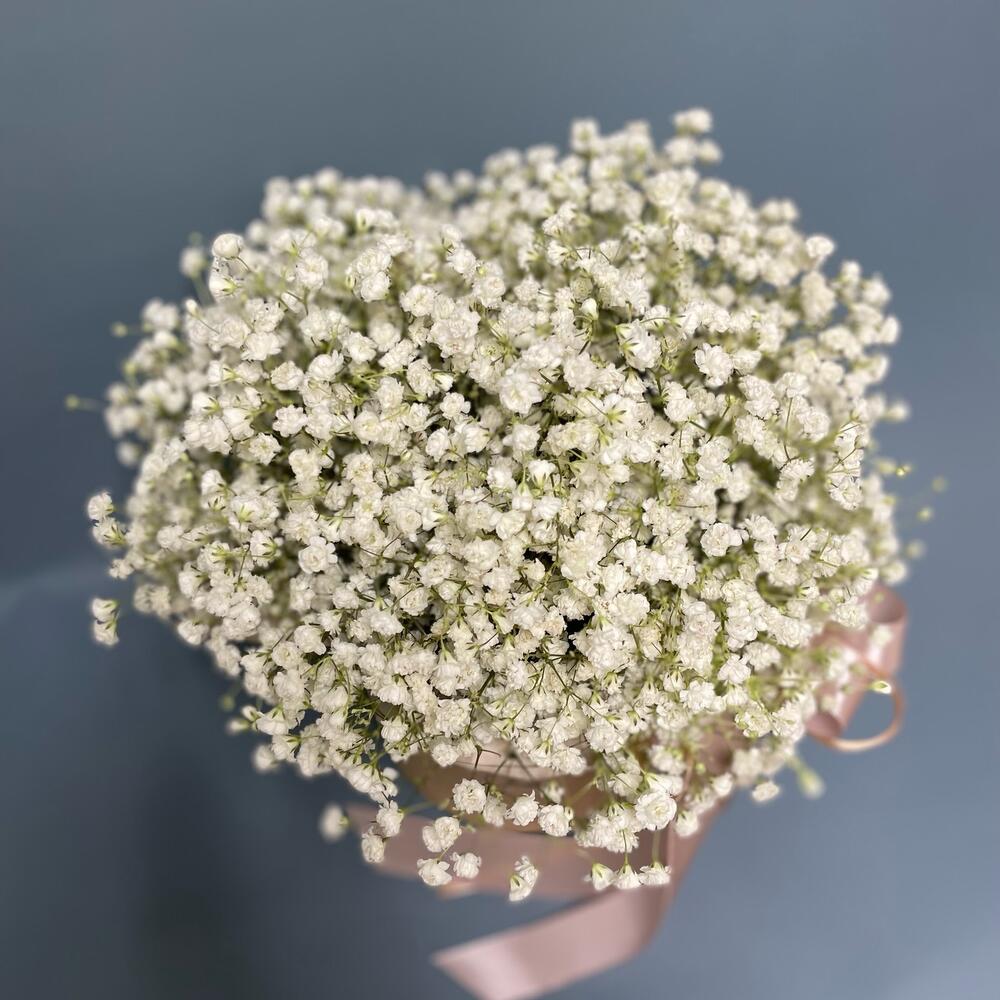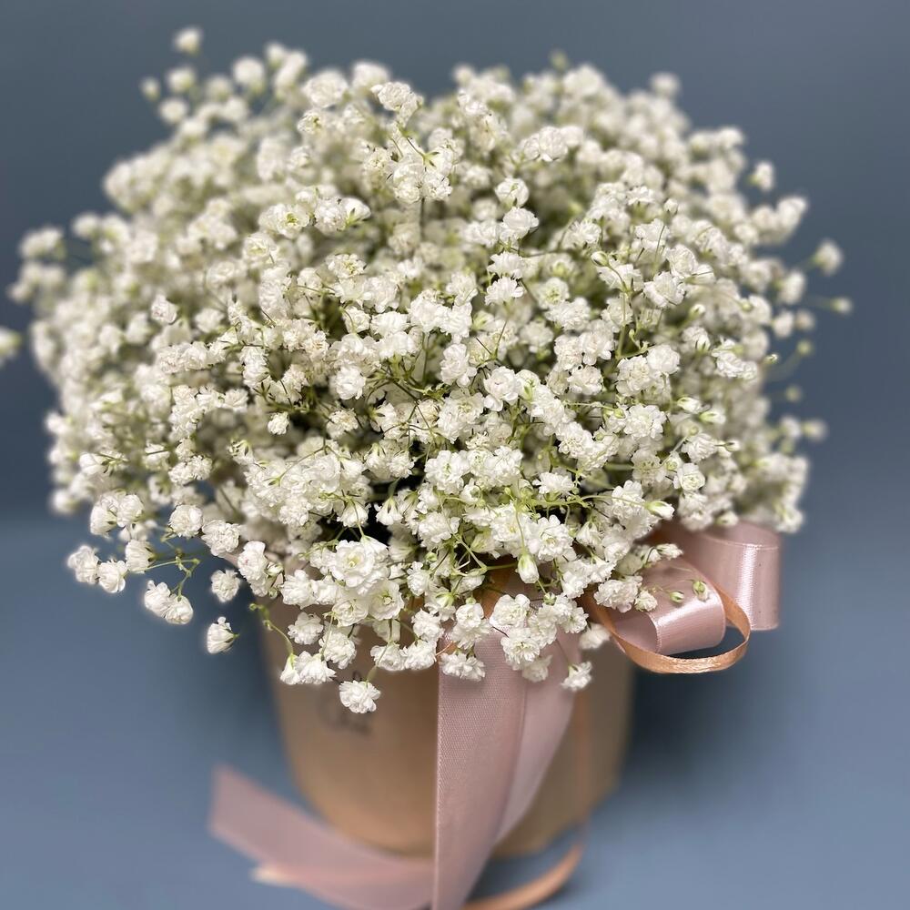 Гипсофила – 9 шт.Коробка шляпная – 1 шт.Оазис флористический – 1 шт.Лента атласная – 2 шт.