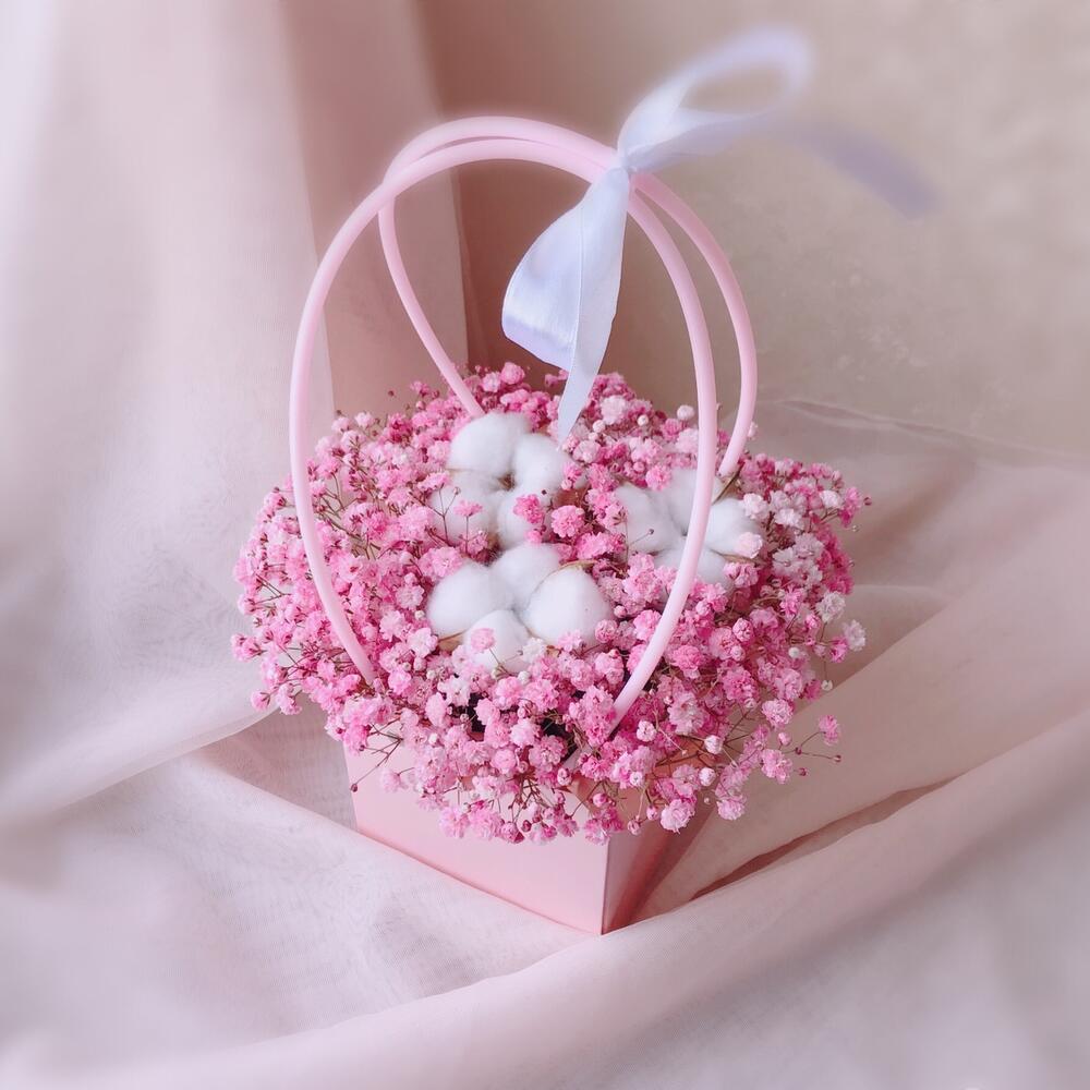 Очаровательная композиция из изысканных свежих цветов.Наполнена множеством соцветий розовой гипсофилы и мягкого хлопка. Собрана в стильной сумочке.Композиция из гипсофилы – необычный подарок, который удивит своей невероятной стойкостью, при правильном и простом уходе.❤️ Ставить композицию в прохладном месте, избегая отопительных приборов и прямых солнечных лучей. ❤️ Подливать немного воды в серединку.Гипсофила не вянет, а становится сухоцветом, сохраняя свой вид. Поэтому композиция продолжит радовать ещё очень долго!Чтобы защитить готовый букет во время доставки от любых погодных условий, мы бережно его упаковываем