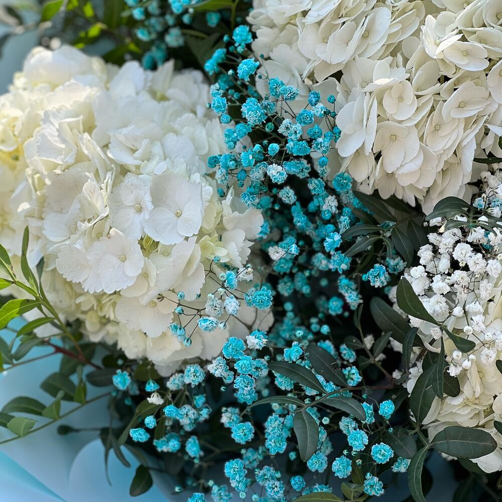 Гортензия – 5 шт. Гипсофила – 5 шт. Фисташка – 10 шт. Упаковка дизайнерская – 8 шт. Лента – 1 шт.