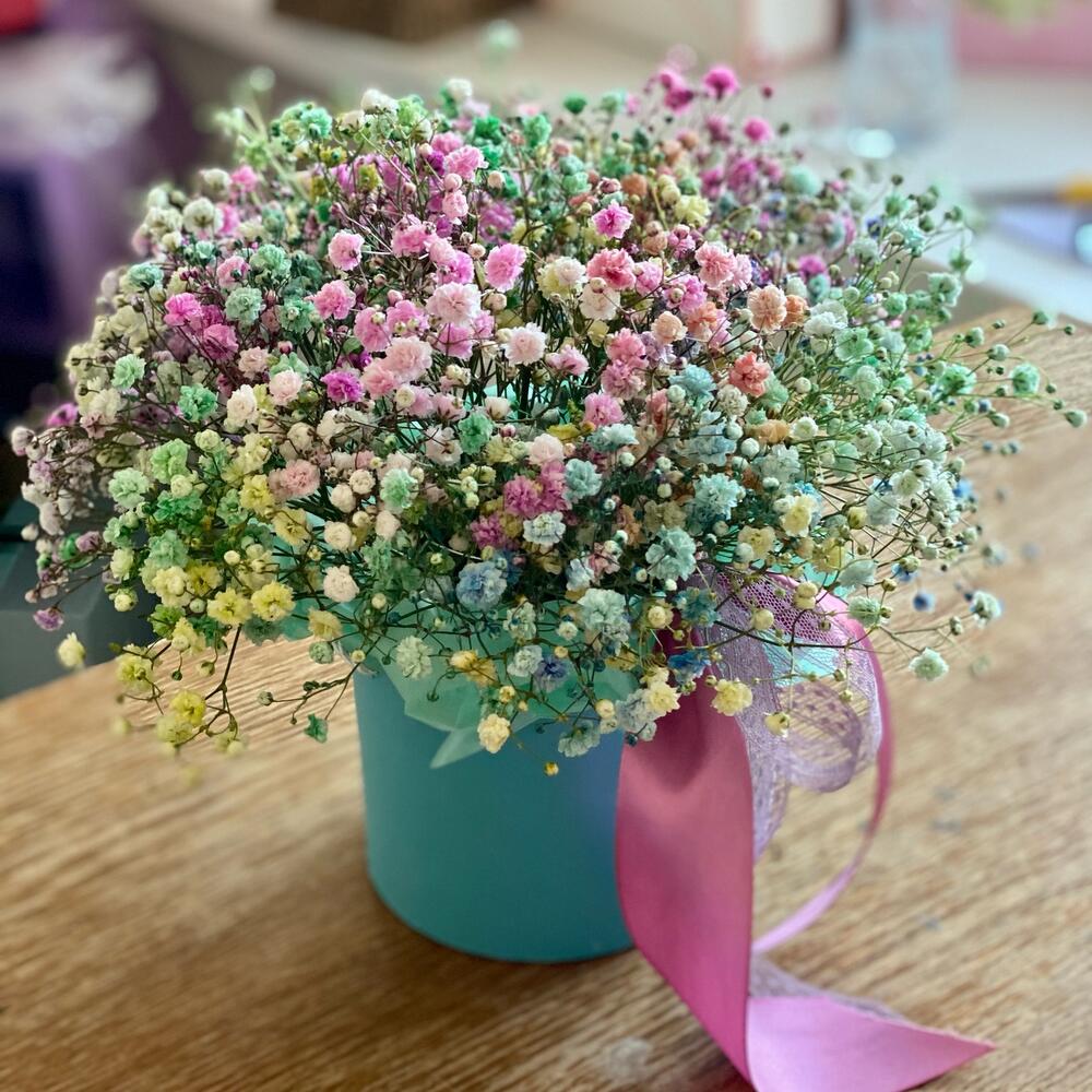 Тишью – 1 шт.Оазис – 1 шт.Шляпная коробка – 1 шт.гипсофила радужная – 5 шт.