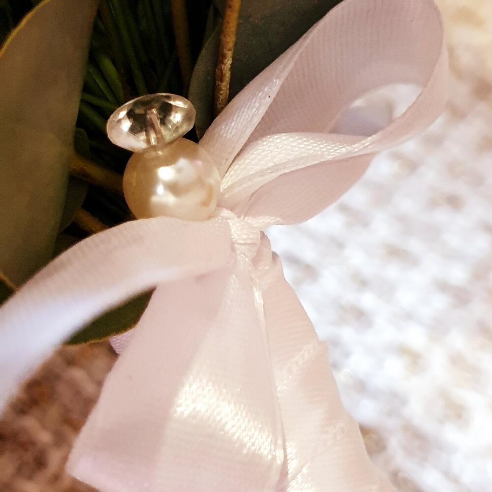 Лента атласная – 10 шт.Эвкалипт Baby Blue – 5 шт.Булавка с бусами – 1 шт.гипсофила белая – 15 шт.
