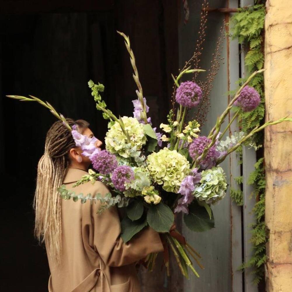 Гортензия – 5 шт.Аллиум – 5 шт.Гладиолус – 7 шт.Наперстянка – 5 шт.Лен – 3 шт.Эвкалипт – 9 шт.Лента – 1 шт.