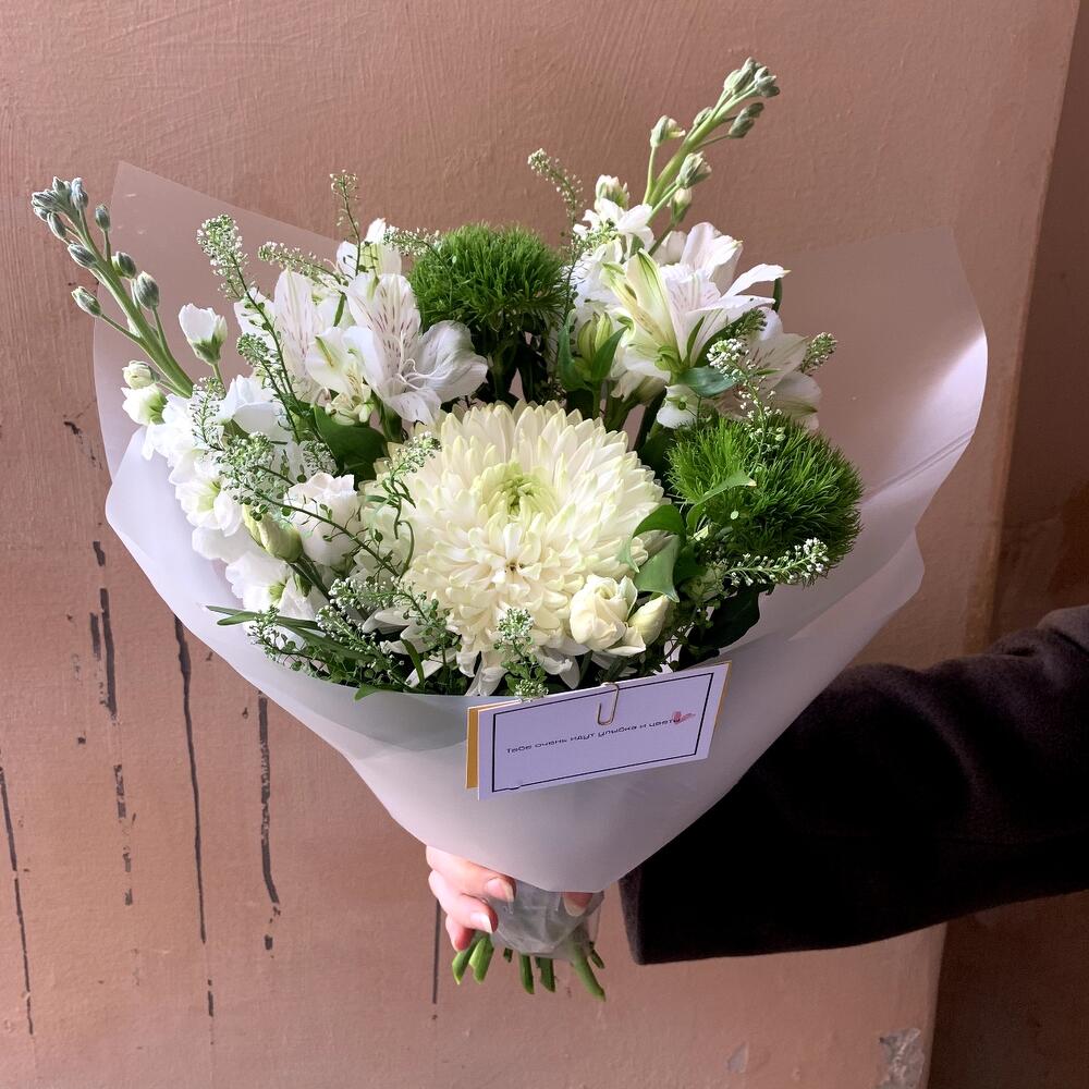 Маттиола – 2 шт.Диантус – 2 шт.Альстромерия белая – 2 шт.Лизиантус белый – 1 шт.Гринбелл – 1 шт.Рускус сочи – 4 шт.Хризантема белая одноголовая – 1 шт.Авторская упаковка – 1 шт.