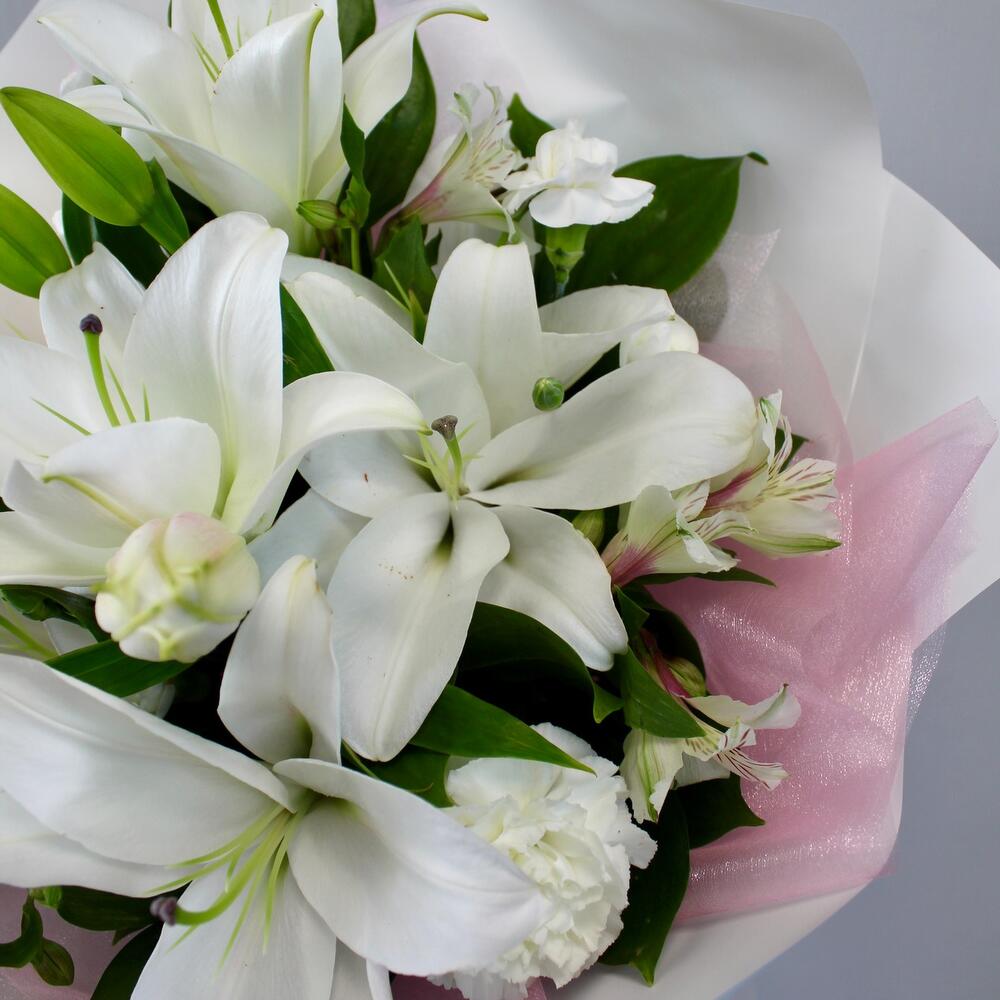 Альстромерия – 3 шт.Лилия – 2 шт.Рускус – 1 шт.Гвоздика кустовая – 4 шт.Упаковка дизайнерская – 3 шт.