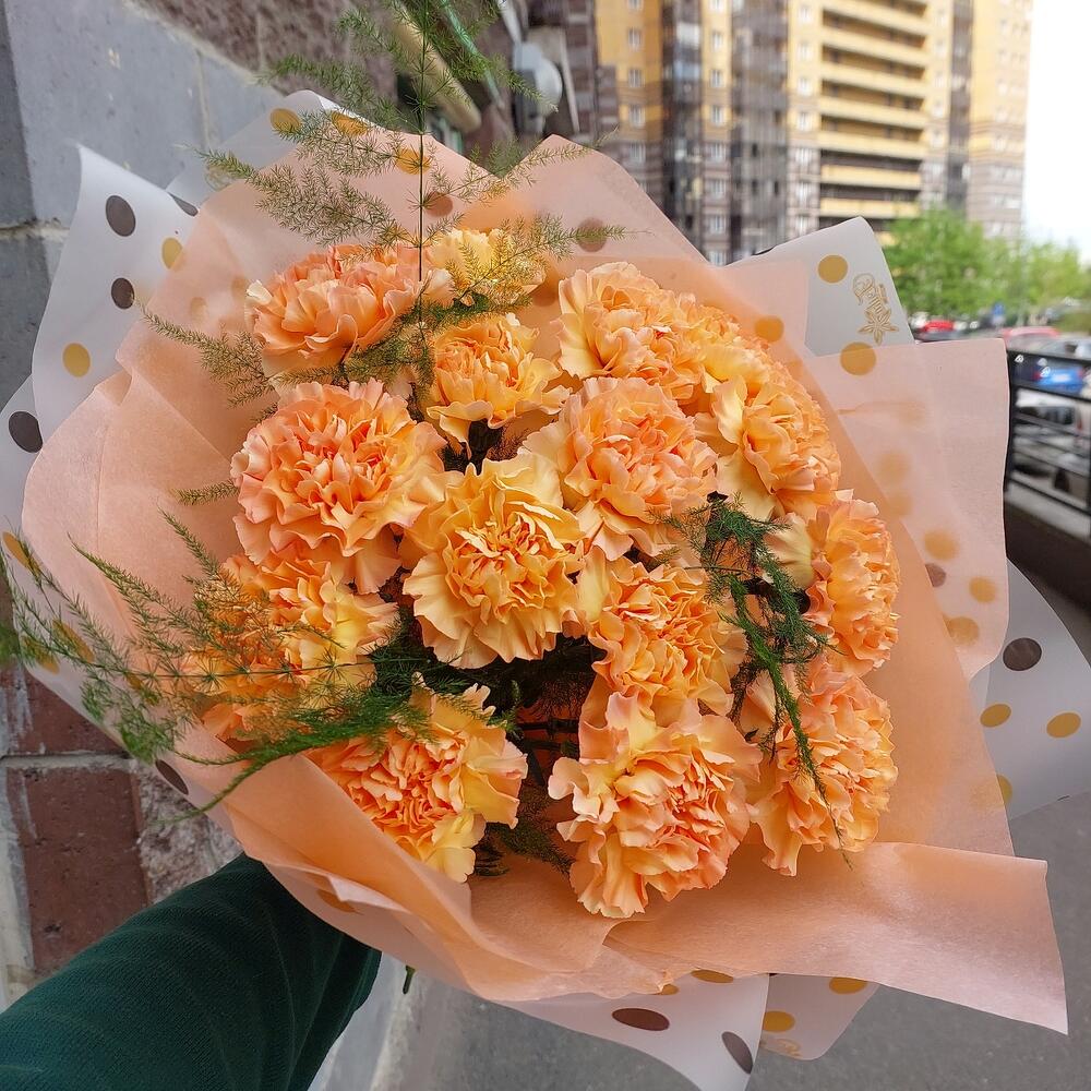 Лента атласная – 1 шт.Аспарагус – 3 шт.Упаковка дизайнерская – 2 шт.Диантус сортовой – 15 шт.Бумага тишью – 2 шт.