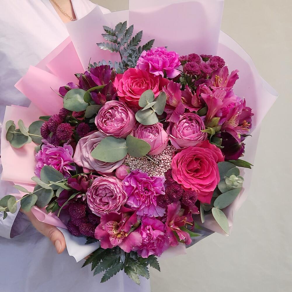 Роза кустовая пионовидная – 1 шт.Роза – 3 шт.Диантус – 4 шт.Сантини – 4 шт.Альстромерия Микс Европа – 4 шт.Озотамнус – 1 шт.Эвкалипт – 3 шт.Рускус – 12 шт.Упаковка дизайнерская – 2 шт.Лента атласная – 1 шт.