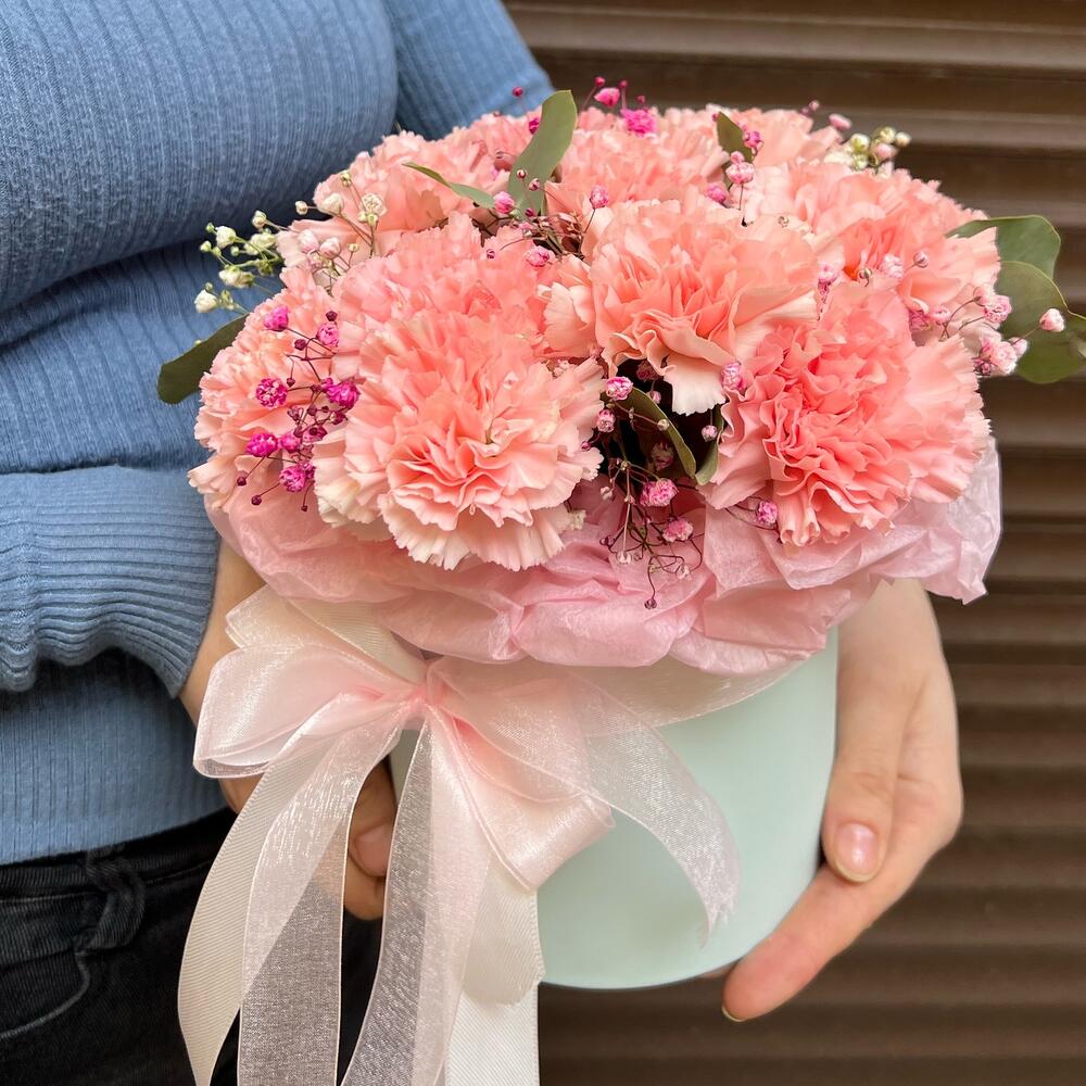 Эвкалипт – 5 шт.Оазис флористический – 1 шт.Диантус сортовой – 13 шт.Гипсофила розовая – 1 шт.коробка шляпная s – 1 шт.