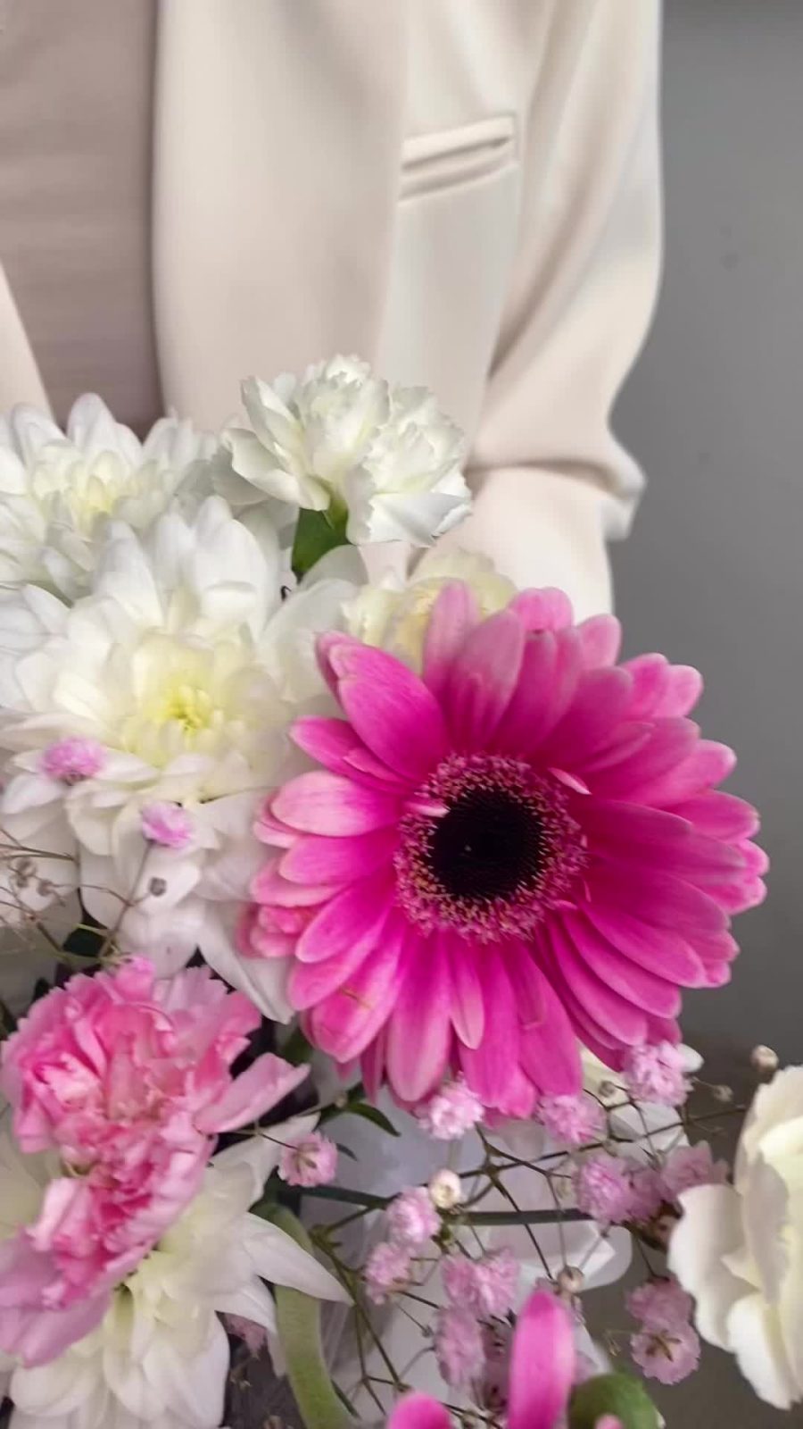 Гермини – 5 шт.Хризантема кустовая – 3 шт.Коробка шляпная – 1 шт.Диантус кустовой – 6 шт.Оазис флористический – 1 шт.