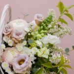 Корзина с цветами с ирисами и ранункулюсами