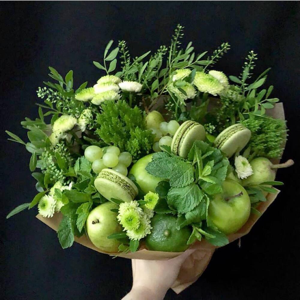 Яблоко – 5 шт.Лайм – 4 шт.Груша – 4 шт.Виноград – 3 шт.Мята – 5 шт.Фисташка – 5 шт.Макарон – 3 шт.Гвоздика – 1 шт.Альстромерия – 1 шт.Хризантема – 3 шт.
