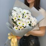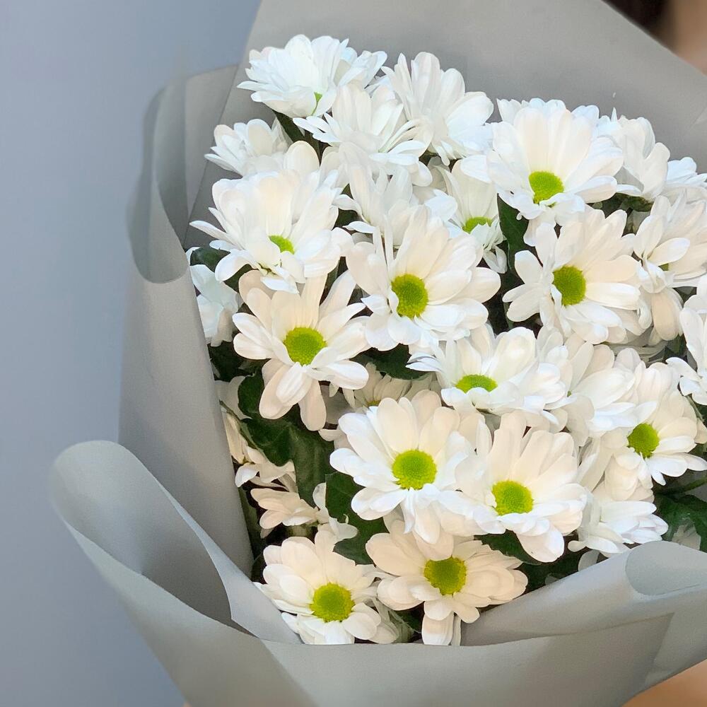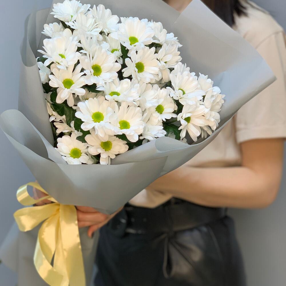 Красиво оформленный лаконичный букет ромашек (хризантем) подойдет для любовного повода: свидание , день рождения , подарок подруге.