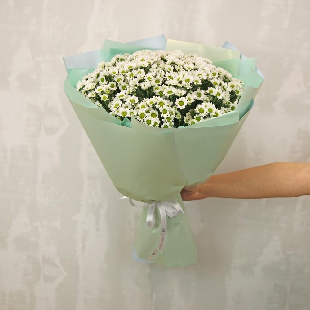 Букет из 25 белых кустовых хризантем Сантини в стильной упаковке