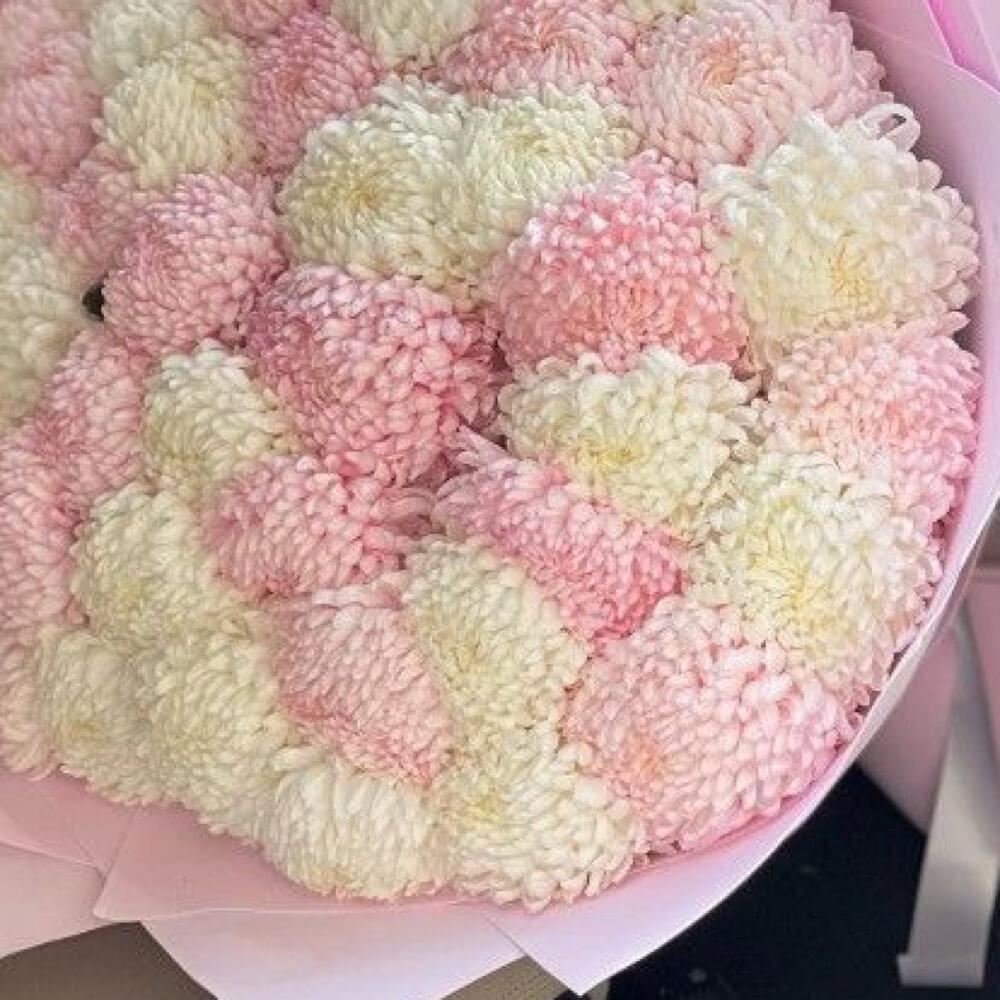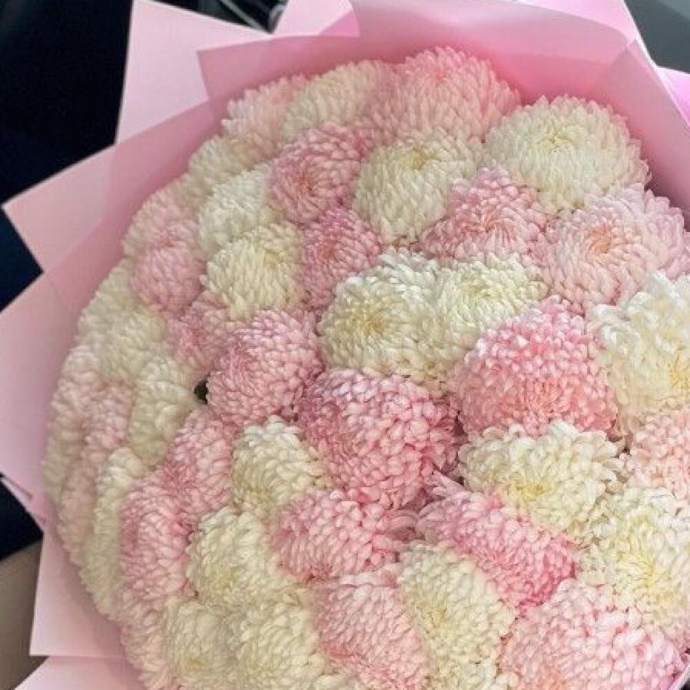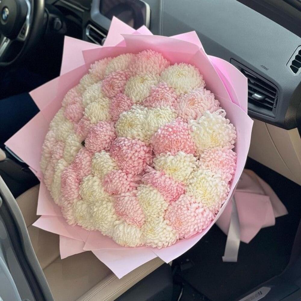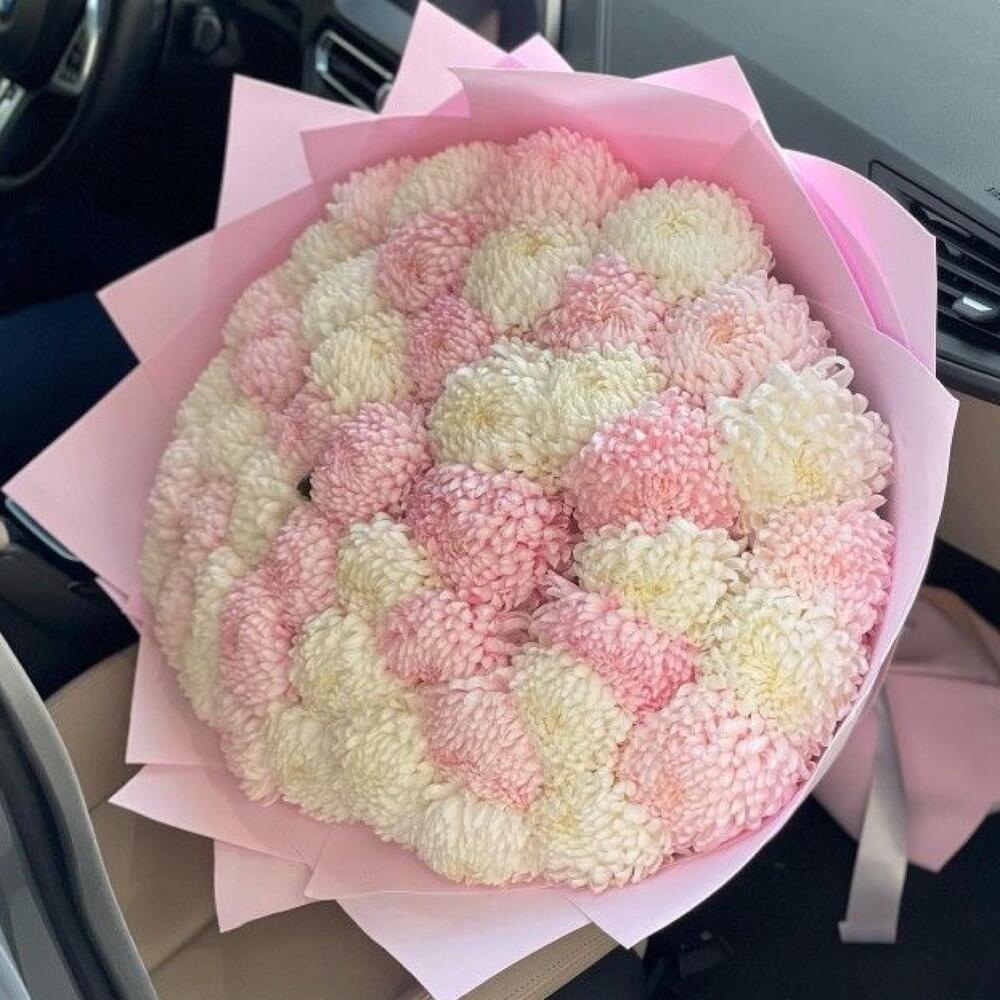 хризантемы розовые – 25 шт.Хризантема белая – 26 шт.Упаковка дизайнерская – 2 шт.Лента атласная – 2 шт.Открыточка с вашими пожеланиями – 1 шт.инструкция по уходу за цветами – 1 шт.коробка переноска – 1 шт.хорошее настроение – 100 шт.Кризал – 1 шт.