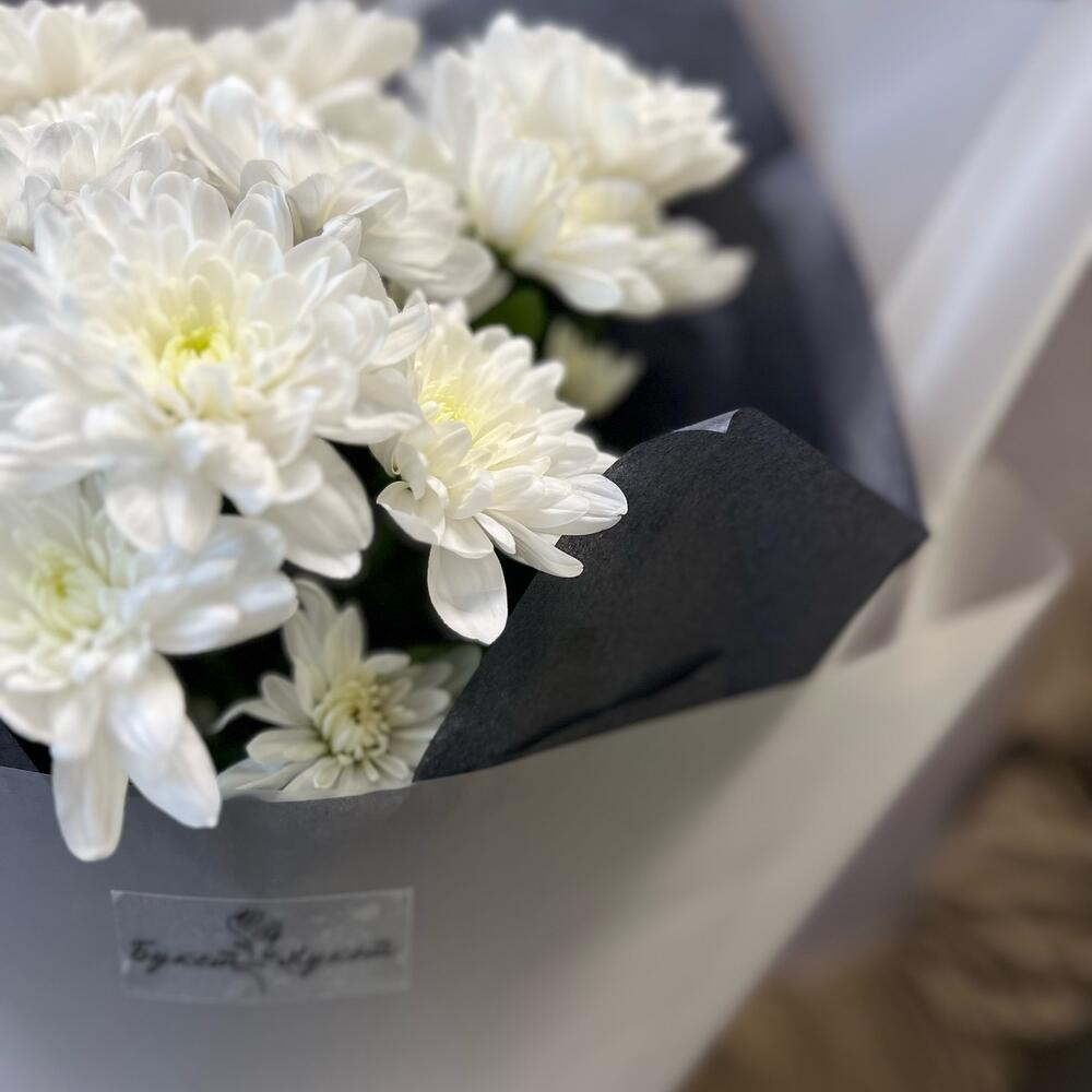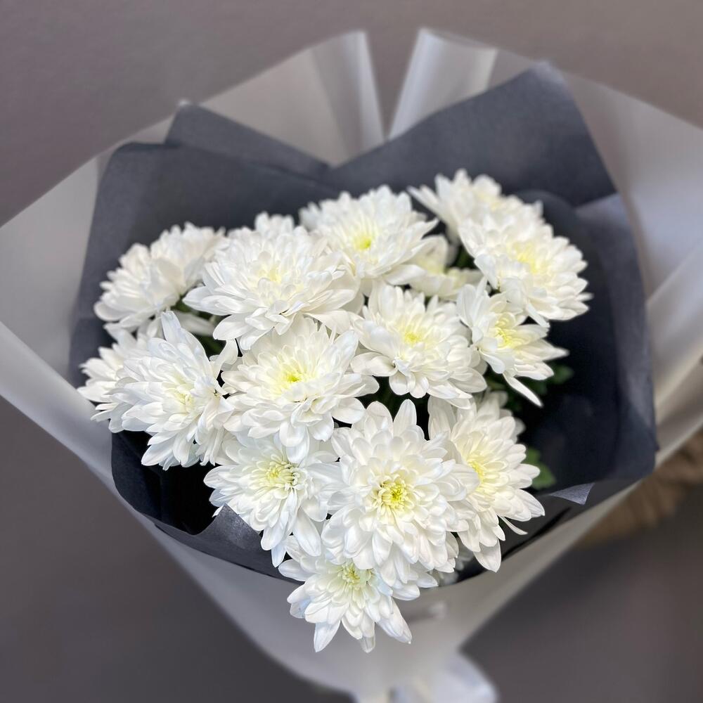 Хризантема кустовая – 3 шт.Лента атласная – 1 шт.Тишью – 2 шт.Пленка – 2 шт.
