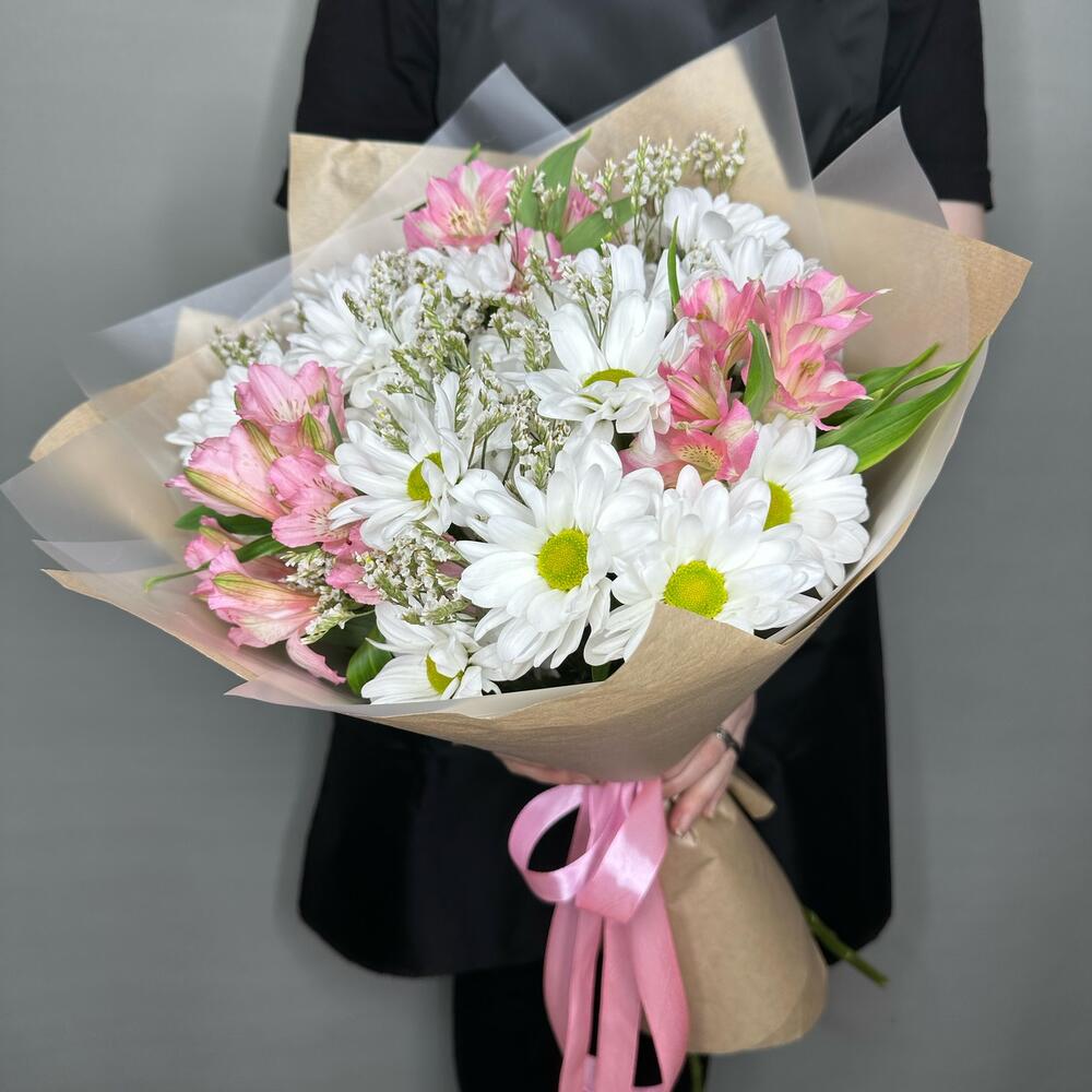 Хризантема кустовая ромашковая – 4 шт.Альстромерия – 3 шт.Лимониум – 1 шт.Упаковка дизайнерская – 1 шт.Лента атласная – 1 шт.