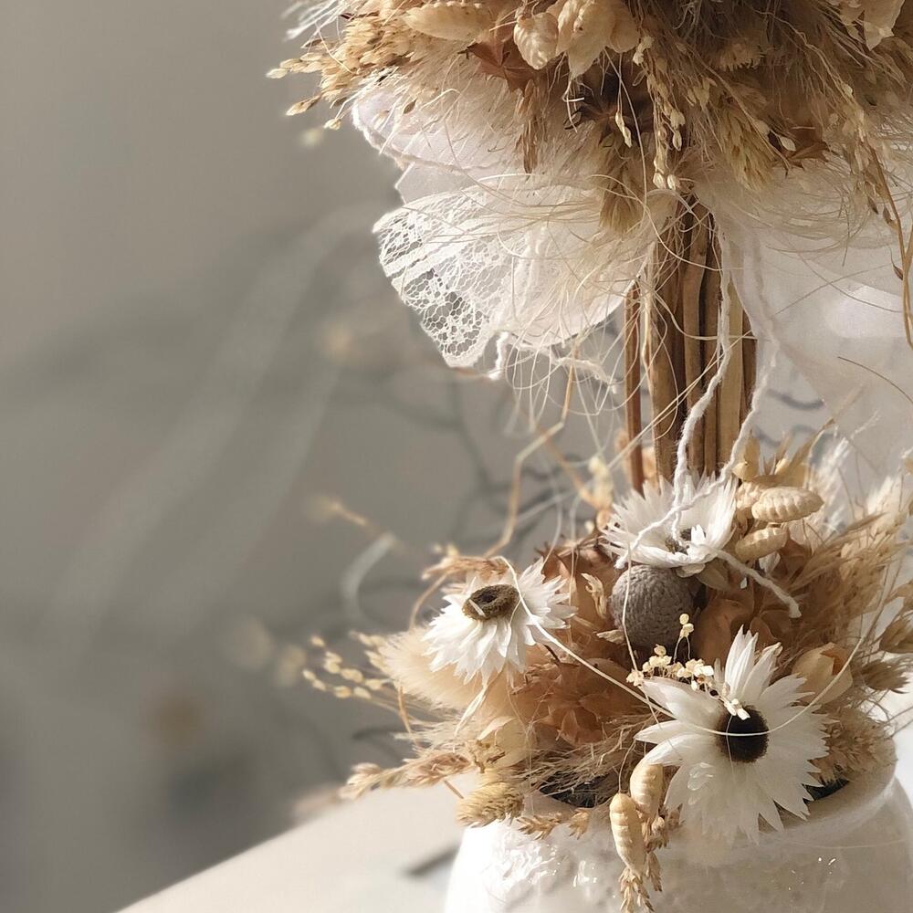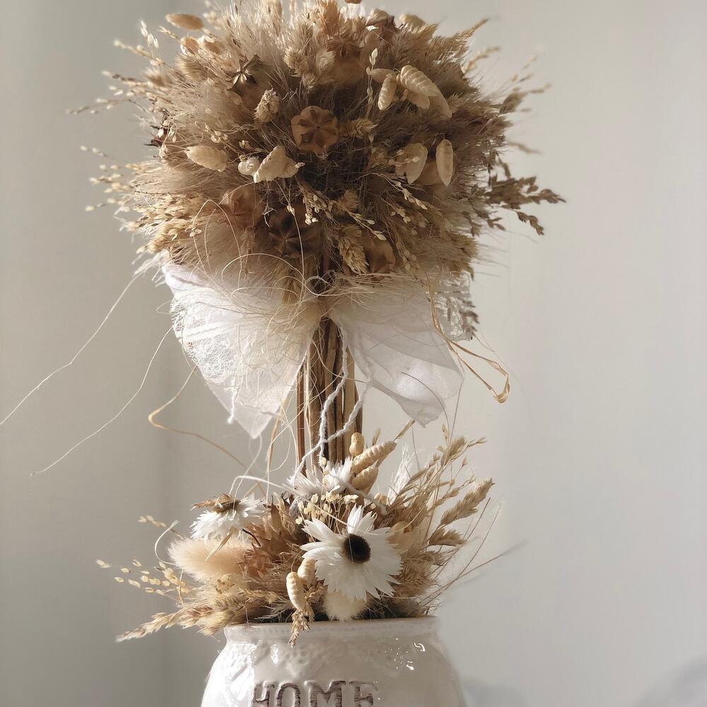 букет сухоцветов микс – 5 шт.Кашпо керамическое – 1 шт.Оазис флористический – 1 шт.гелихризум пучок – 2 шт.Лента Кружево – 2 шт.бриза пучок – 3 шт.