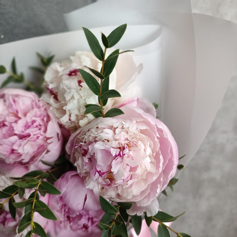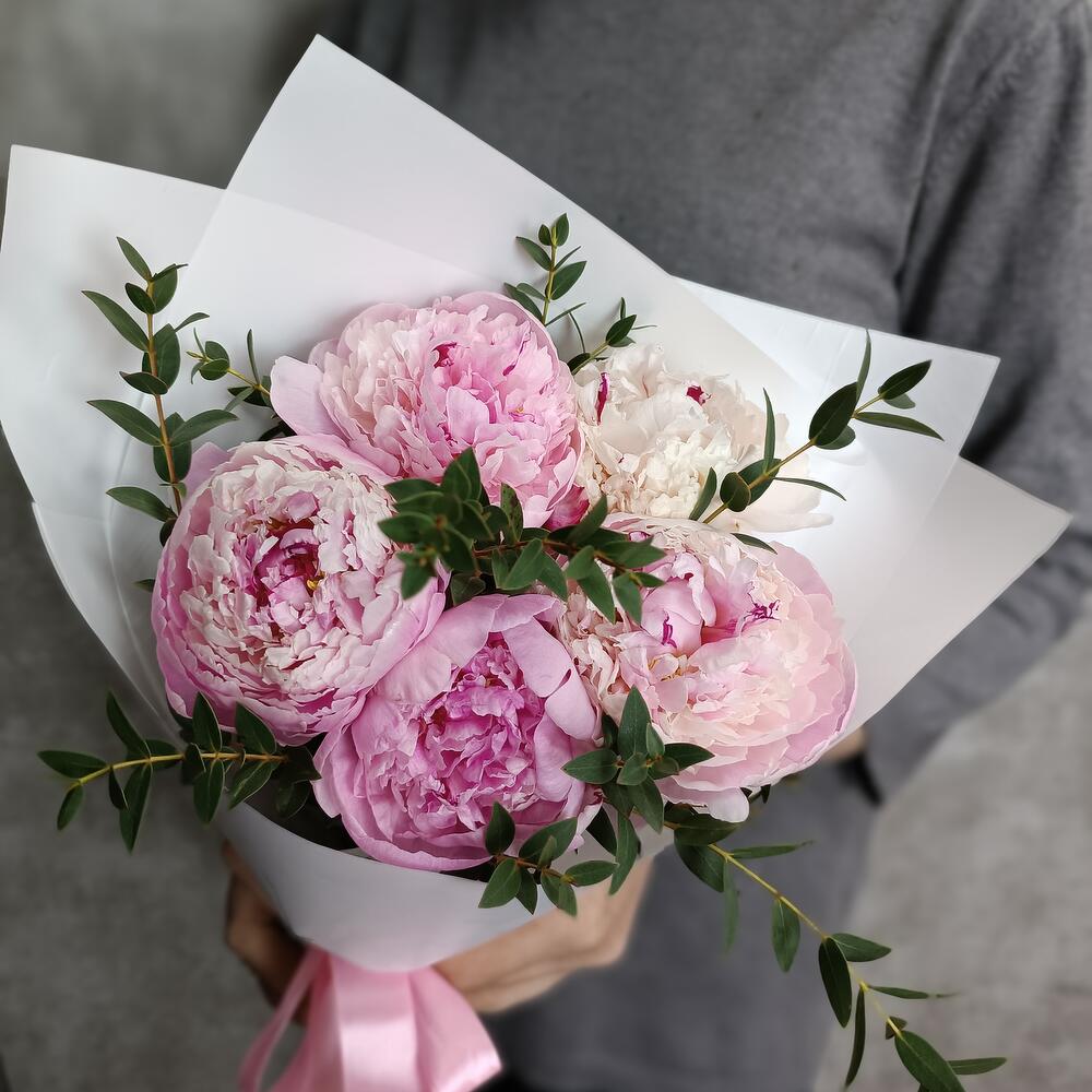 Пион Сара Бернар – 5 шт.Эвкалипт – 1 шт.Упаковка дизайнерская – 1 шт.Лента атласная – 2 шт.