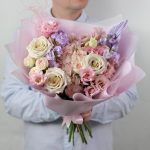 Гортензия – 1 шт.Маттиола – 3 шт.Писташ – 4 шт.Лента атласная – 1 шт.Роза кустовая пионовидная – 2 шт.Упаковка дизайнерская – 4 шт.эустома розовая – 3 шт.Стифа – 2 шт.Роза мента 50 см – 3 шт.пика пальма – 1 шт.