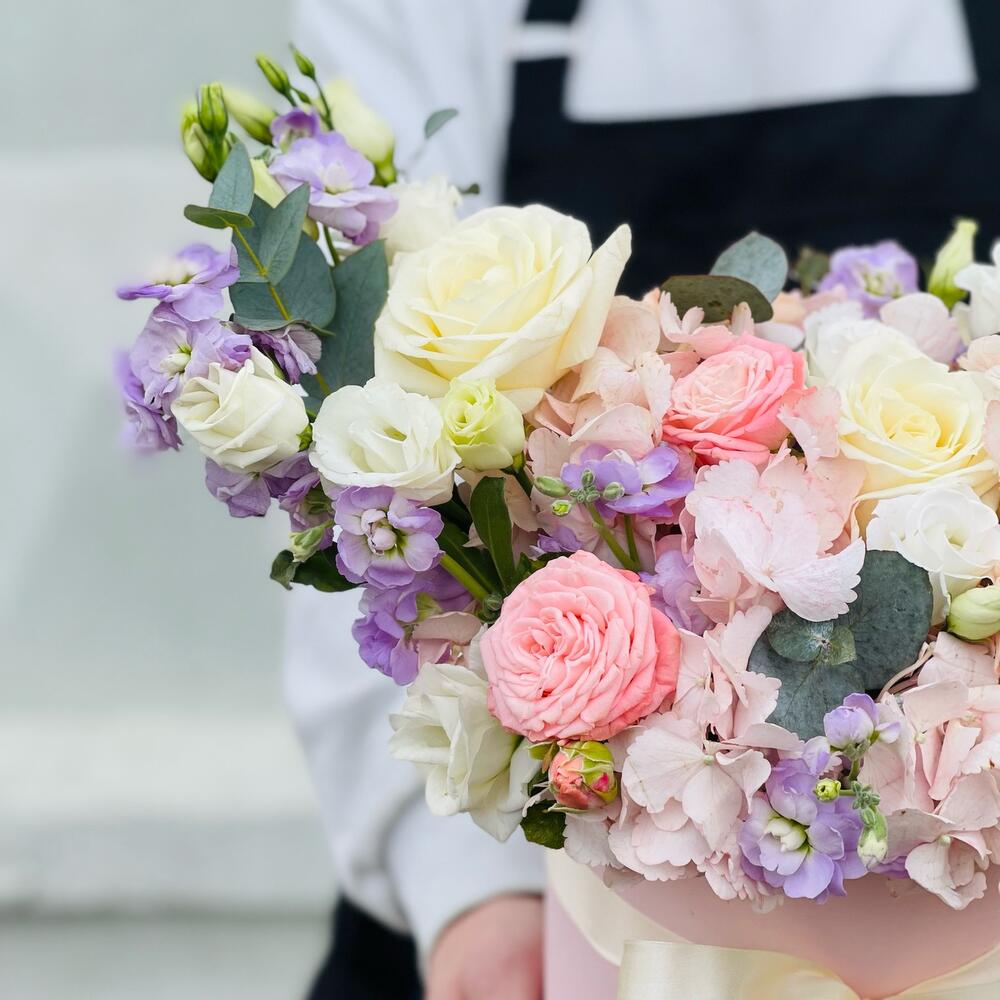 Гортензия – 1 шт.Маттиола – 2 шт.Эвкалипт – 3 шт.Гвоздика – 2 шт.Эустома – 2 шт.Лента атласная – 1 шт.Роза белая – 4 шт.Шляпная коробка – 1 шт.Бомбастик – 3 шт.Оазис флористический – 1 шт.