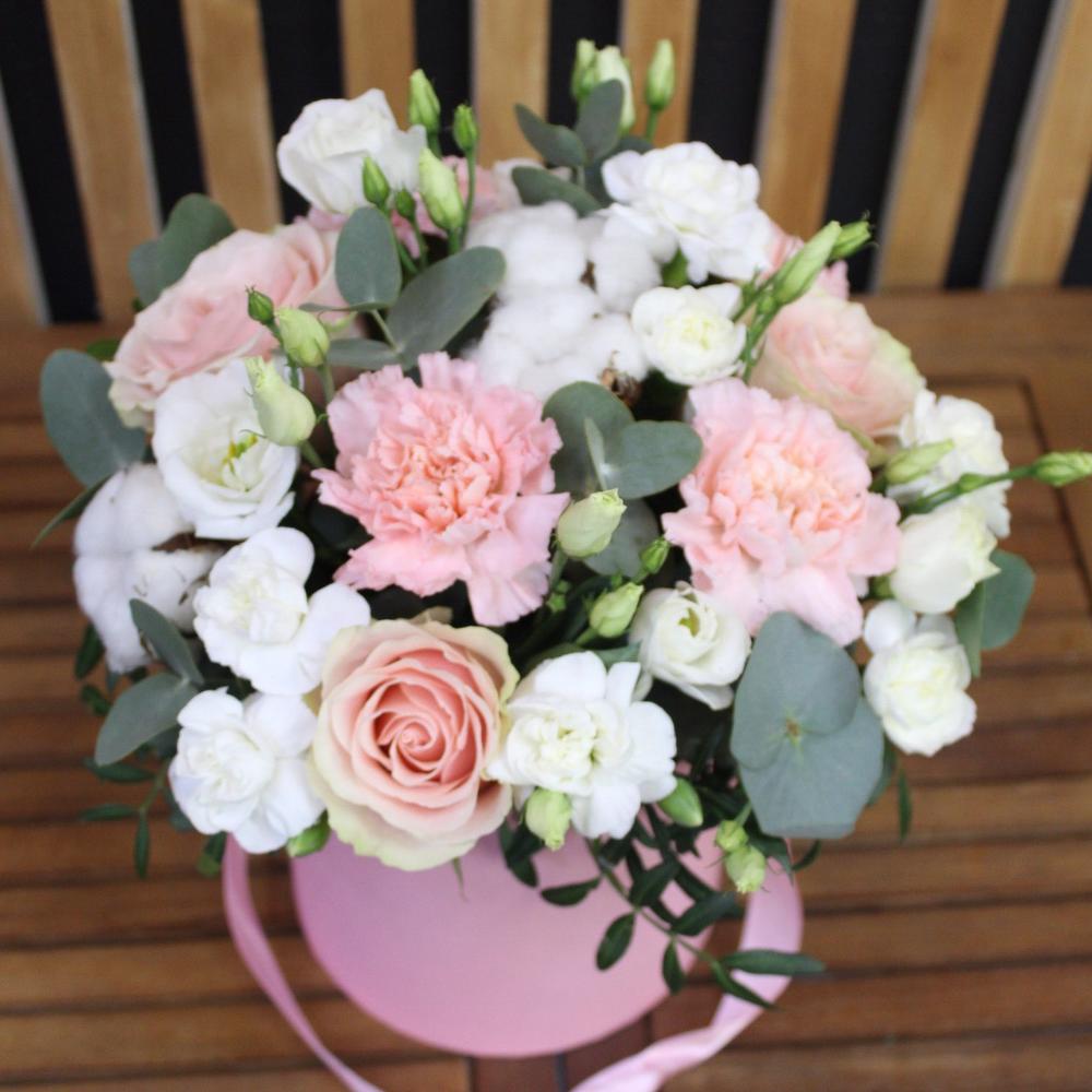 Роза Эквадор – 3 шт.Диантус – 4 шт.лизиантус розита вайт – 2 шт.Эвкалипт – 1 шт.Фисташка – 1 шт.Шляпная коробка – 1 шт.Оазис флористический – 1 шт.Диантус кустовой – 2 шт.Хлопок – 3 шт.