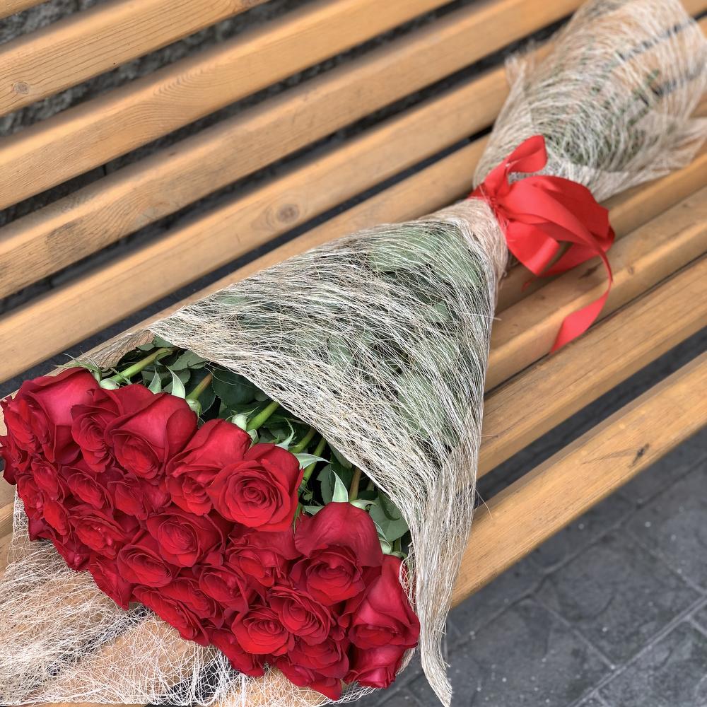 Букет высоких метровых роз стильно оформленный в элитную упаковку сизаль.