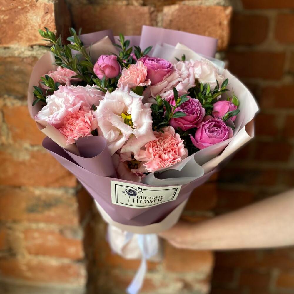 Букет из эустомы, гвоздики и кустовой пионовидной розы в дизайнерской упаковке “Вишневая аллея”