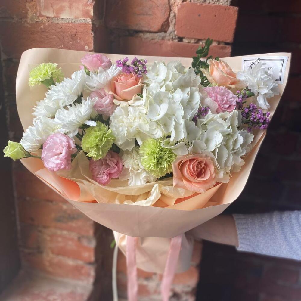Букет из гортензии, эустомы, роз, диантуса и статицы в стильной упаковке “Балинезия”