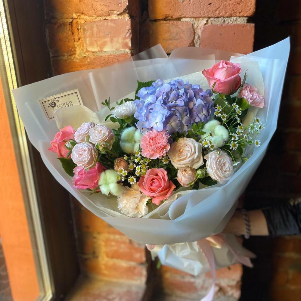 Гортензия – 1 шт.Кустовая роза – 2 шт.Диантус – 5 шт.Роза – 4 шт.Хлопок – 3 шт.Матрикария – 2 шт.Самшит – 2 шт.Упаковка – 2 шт.