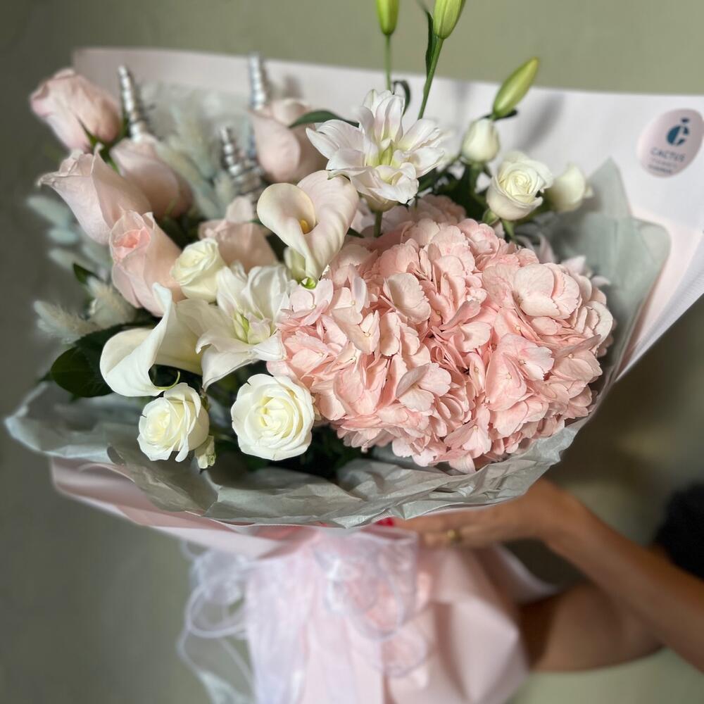 Альстромерии, Гортензии, Кустовые розы, Лизиантусы, Розы, Хризантемы