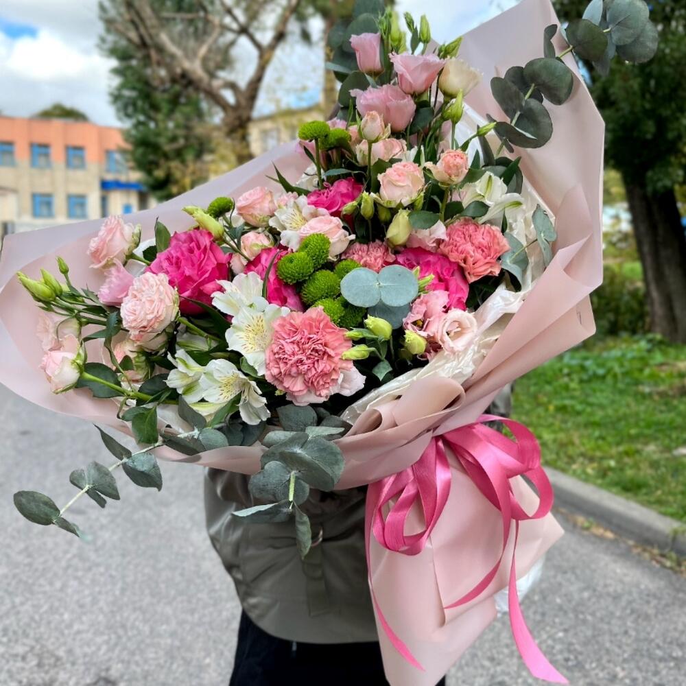 Альстромерии, Гвоздики, Кустовые розы, Лизиантусы, Розы, Хризантемы