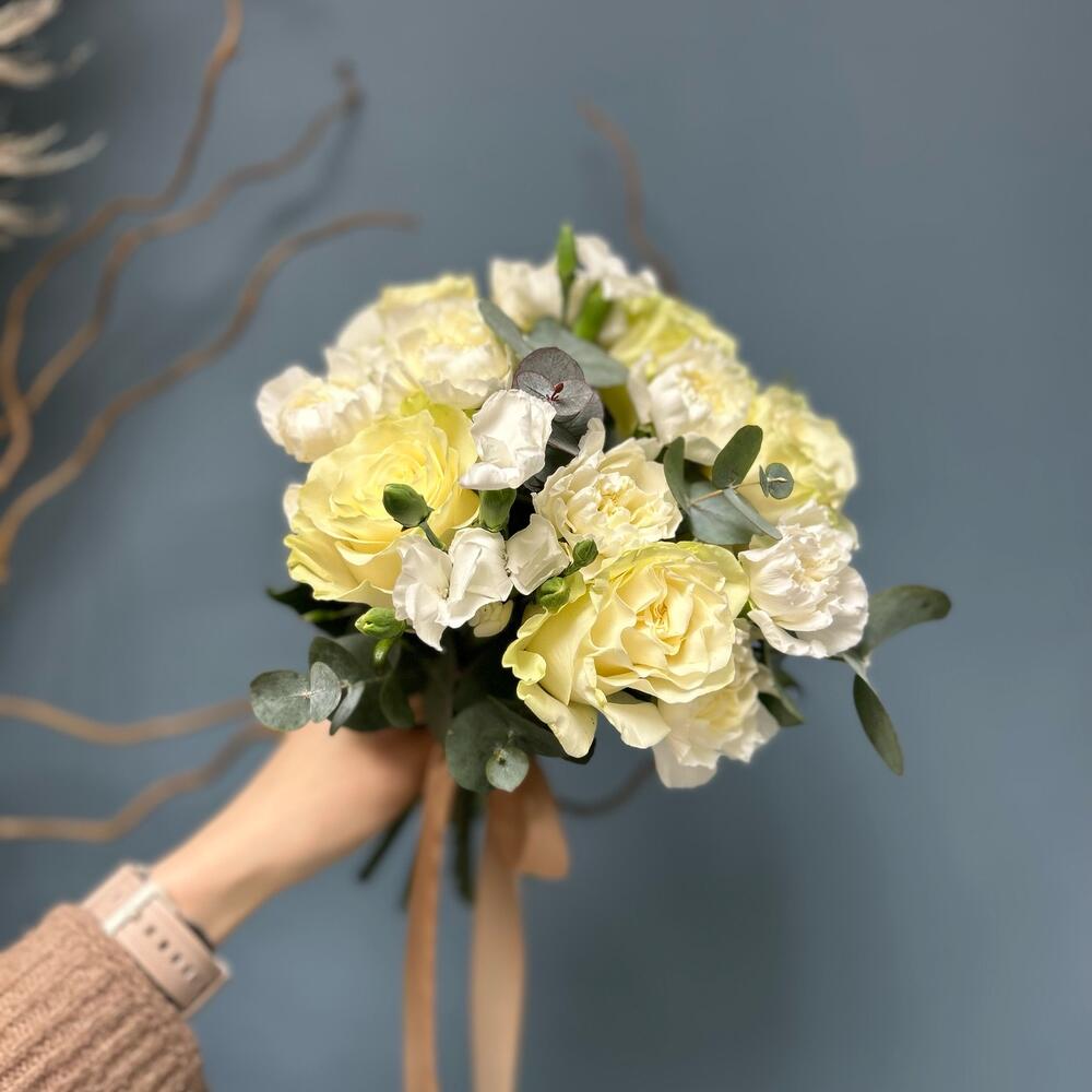 Эвкалипт – 1 шт.гвоздика соломио – 3 шт.Гвоздика – 7 шт.Роза Мондиаль – 5 шт.Лента атласная – 1 шт.
