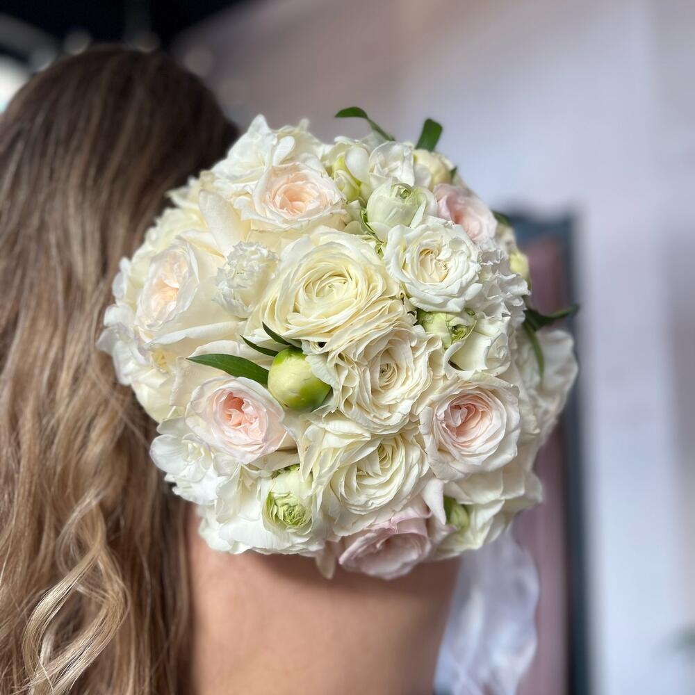 Ранункулюс – 7 шт.Пионовидная роза – 7 шт.пионы – 3 шт.Атласная лента – 3 шт.