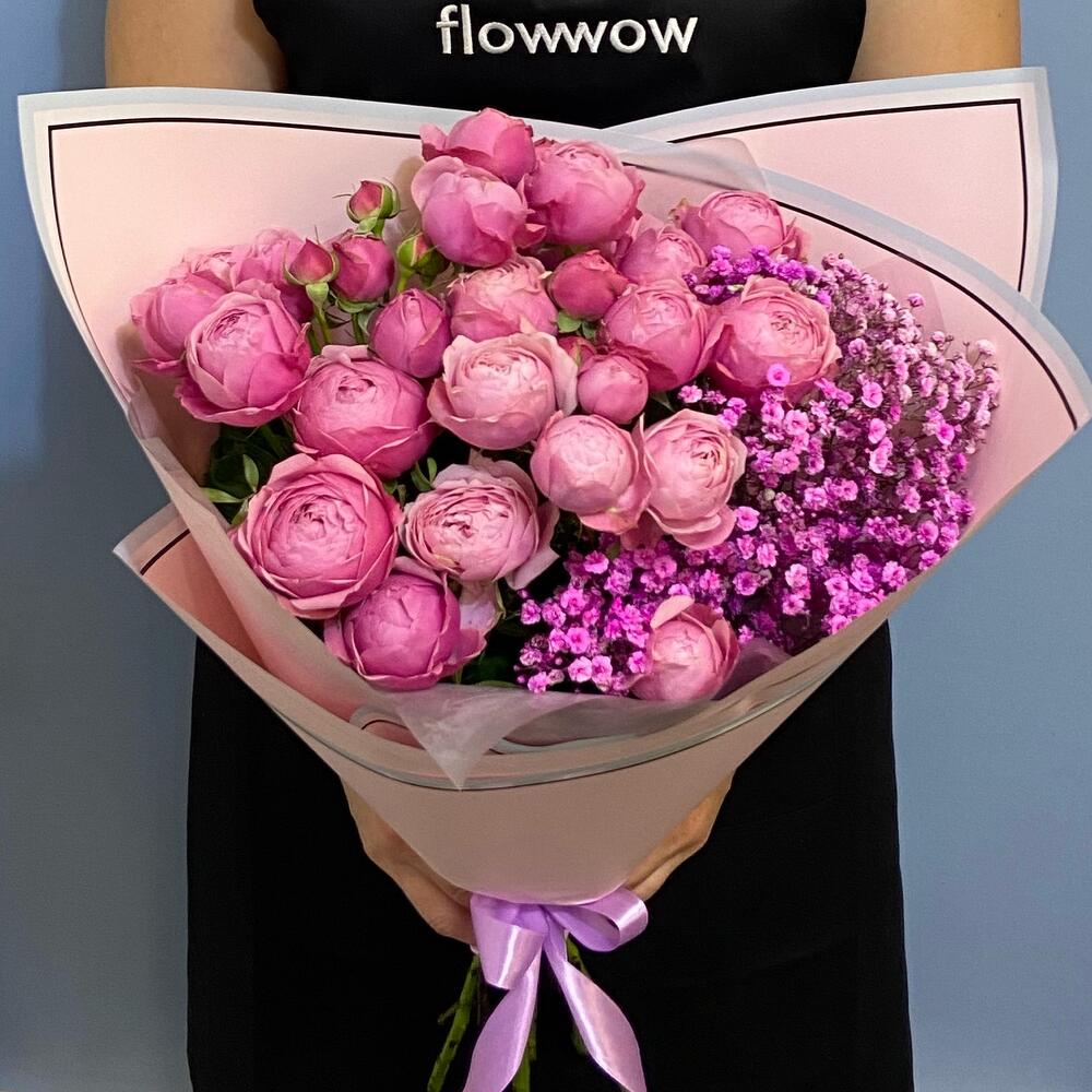 Лента атласная – 1 шт.Упаковка дизайнерская – 2 шт.Гипсофила розовая – 2 шт.пионовидная роза сильва – 5 шт.