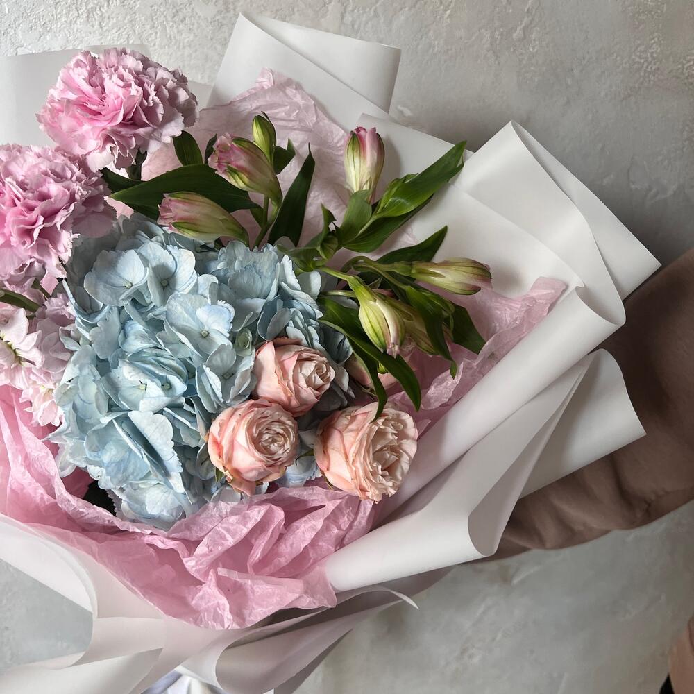 Гортензия – 1 шт.Маттиола – 1 шт.Гвоздика – 1 шт.Роза кустовая – 1 шт.Альстромерия – 1 шт.Упаковка дизайнерская – 1 шт.