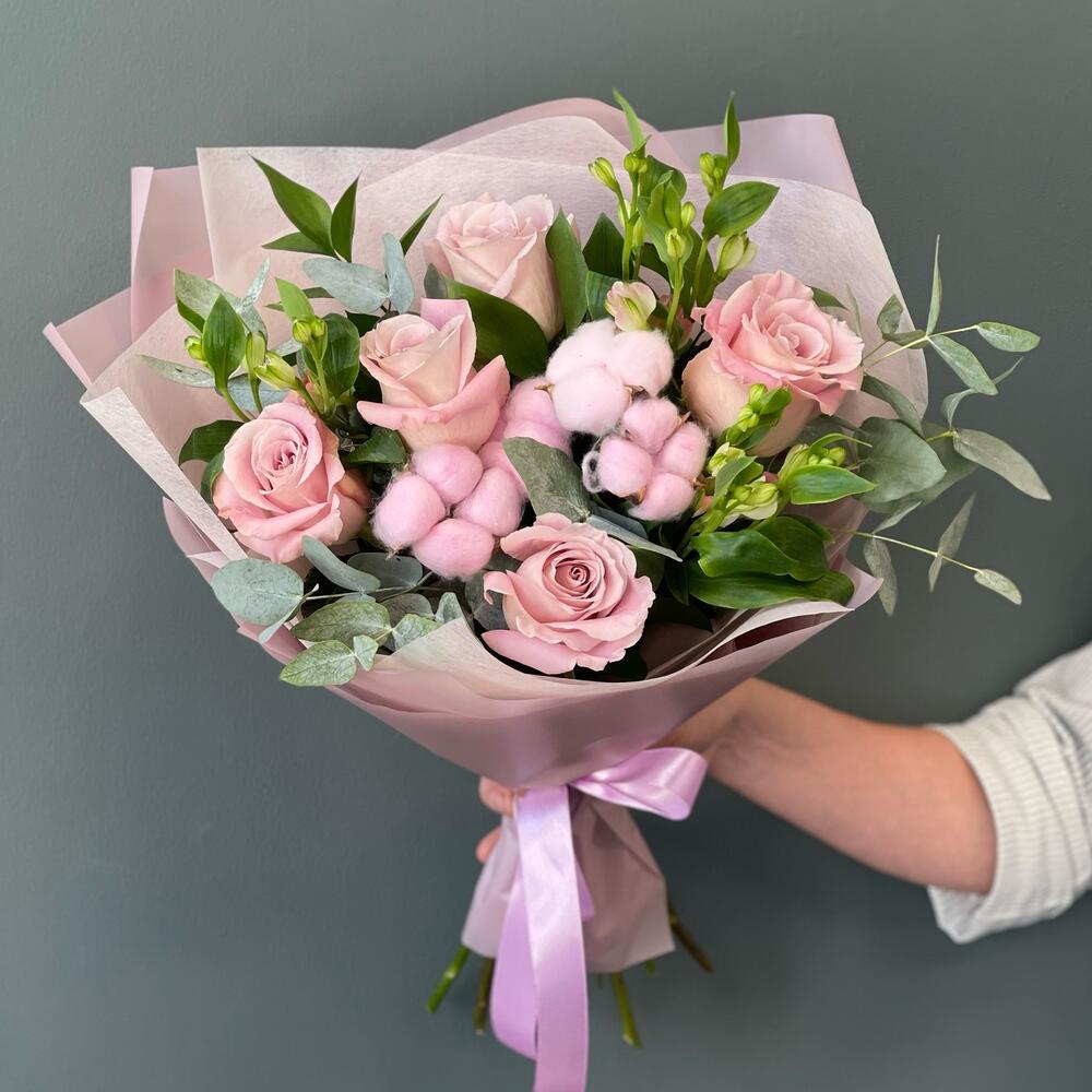 Букет с нежными розами и хлопком “Нежность”