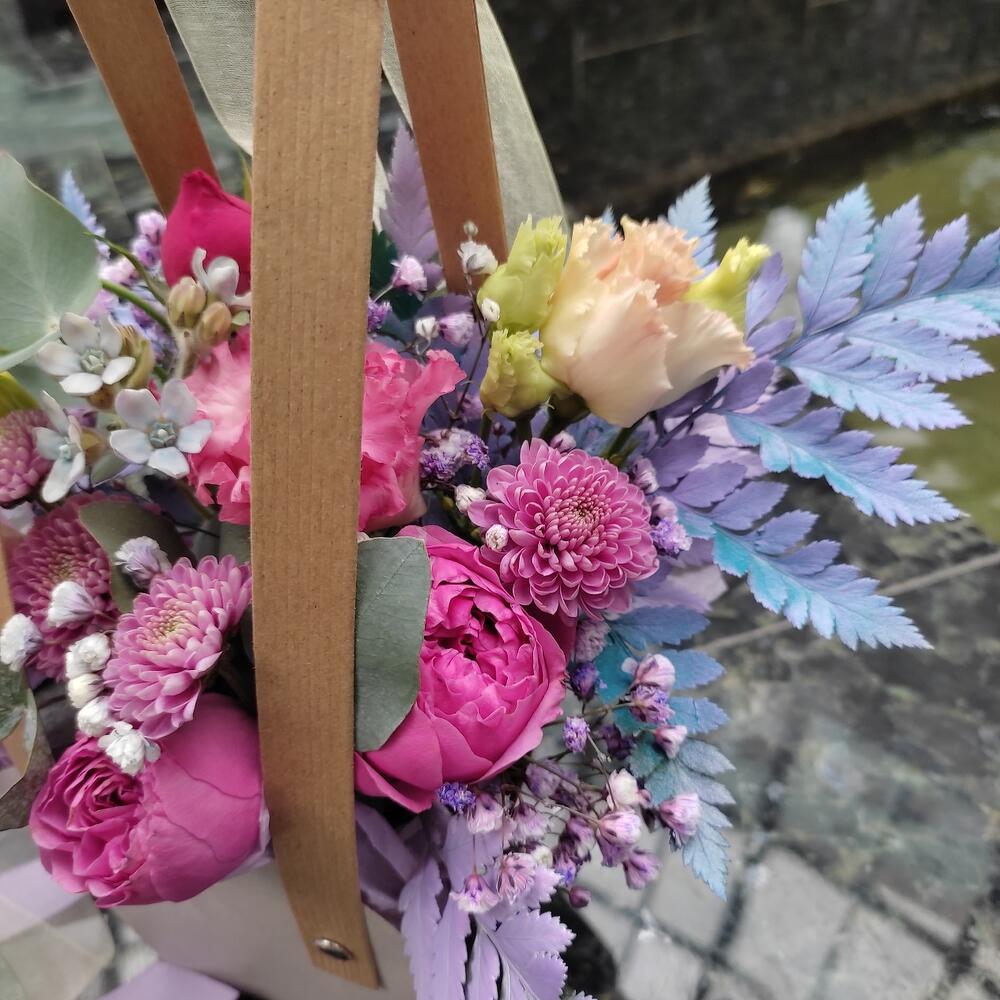 Роза кустовая пионовидная – 1 шт.Хризантема кустовая – 2 шт.Гипсофила – 1 шт.Лизиантус – 1 шт.Ваксфлауэр – 1 шт.Эвкалипт – 1 шт.Папоротник – 2 шт.Лента – 2 шт.Сумочка картонная – 1 шт.