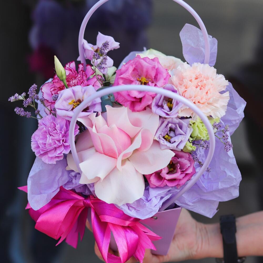Лизиантус – 2 шт.Гвоздика – 2 шт.Роза белая пионовидная – 1 шт.Сумочка – 1 шт.Роза французская – 1 шт.Открыточка с вашими пожеланиями – 1 шт.Шоколадка – 1 шт.