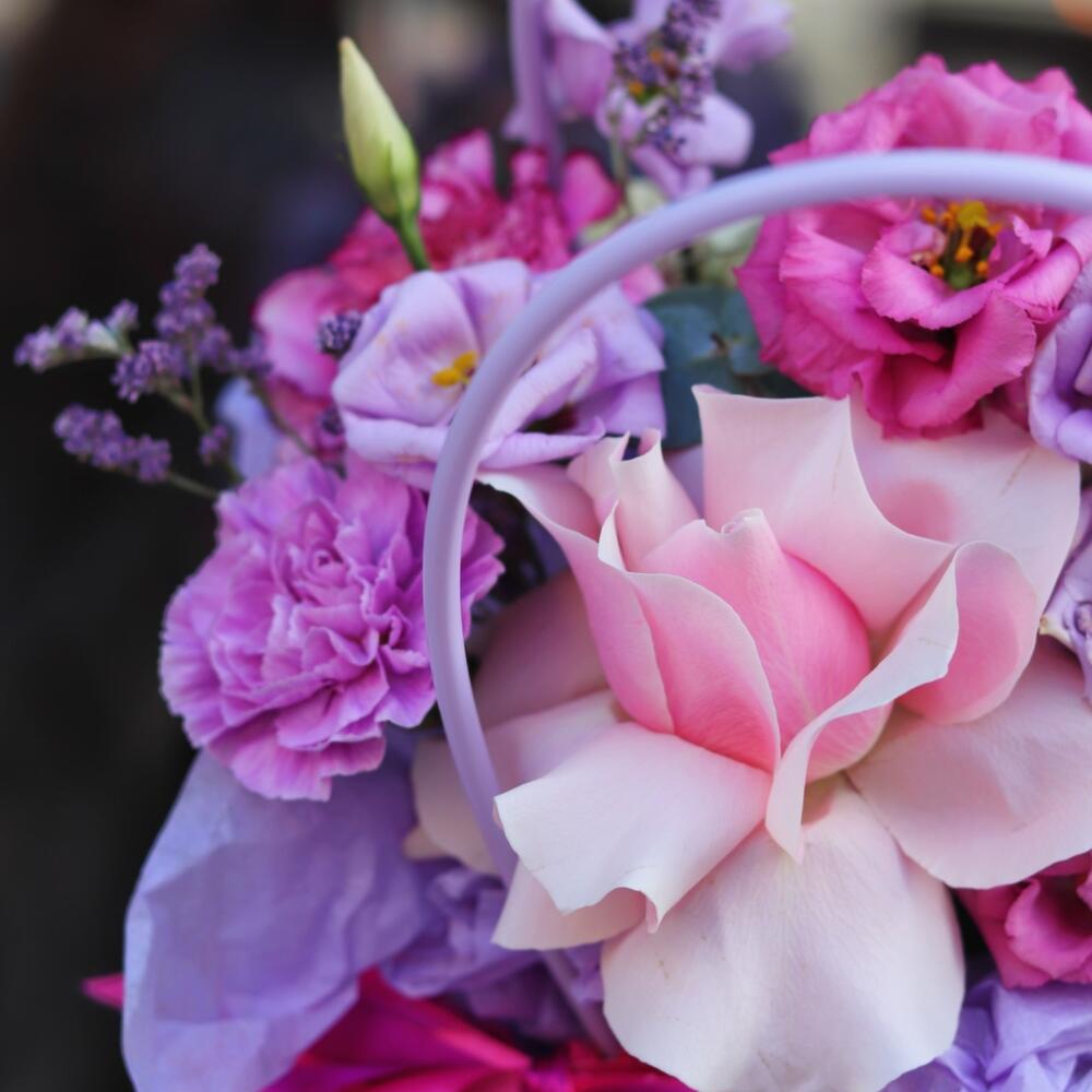 Нежная, чувственная и воздушная композиция, выполненная из роз, лизиантуса и диантусов.Такая композиция точно понравится яркой и энергичной получательнице, и будет долго радовать её.К композиции прилагается открытка с вашими пожеланиями и приятный комплимент от нашего магазина – шоколадка. Мы также будем рады отправить вместе с композицией конфеты, шоколад ручной работы или б/а вино по вашим пожеланиям, просто напишите нам в личные сообщения. Заказывая нашу композицию, Вы всегда получите исключительный сервис и заботу о клиенте