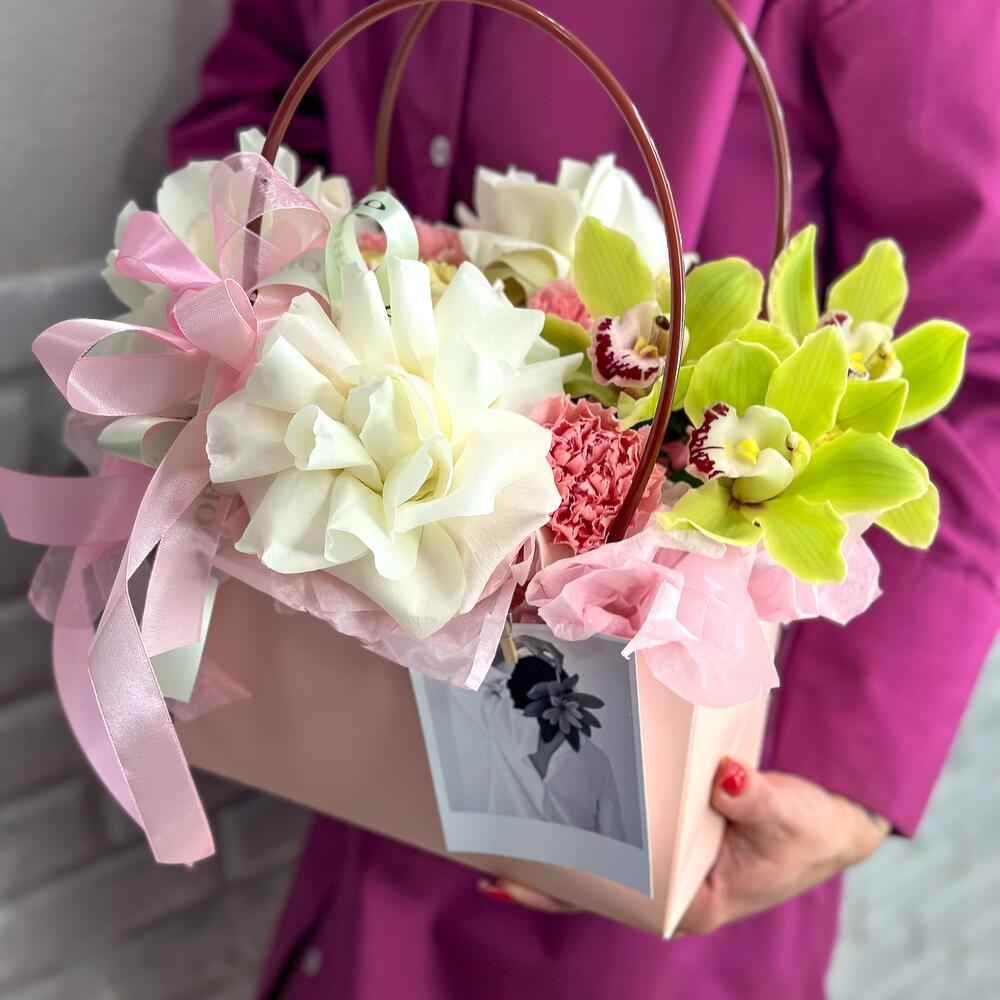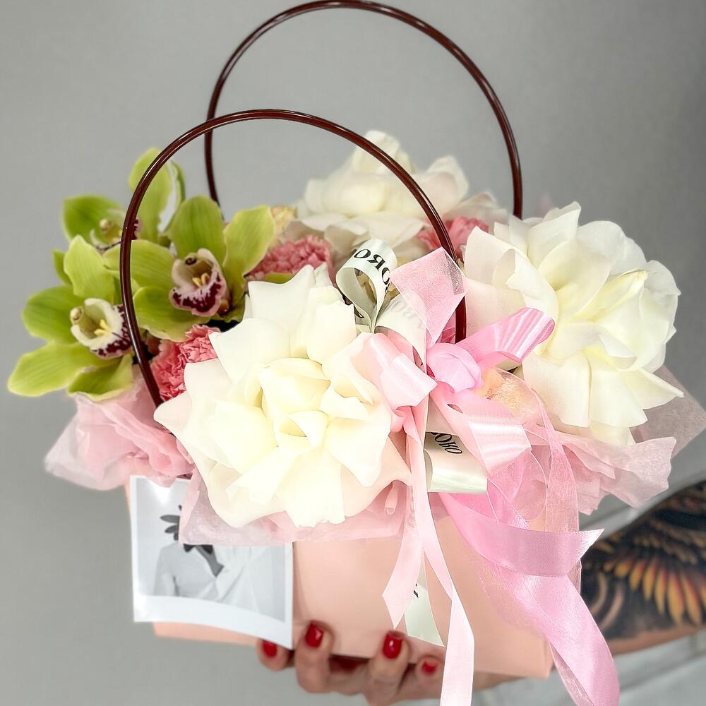 Орхидея Цимбидиум – 3 шт.Открыточка с вашими пожеланиями – 1 шт.Оазис флористический – 1 шт.Сумочка с ручками из плотного картона ламинированого – 1 шт.Диантус сортовой – 5 шт.роза садовая пионовидная – 3 шт.роза playa blanca – 3 шт.