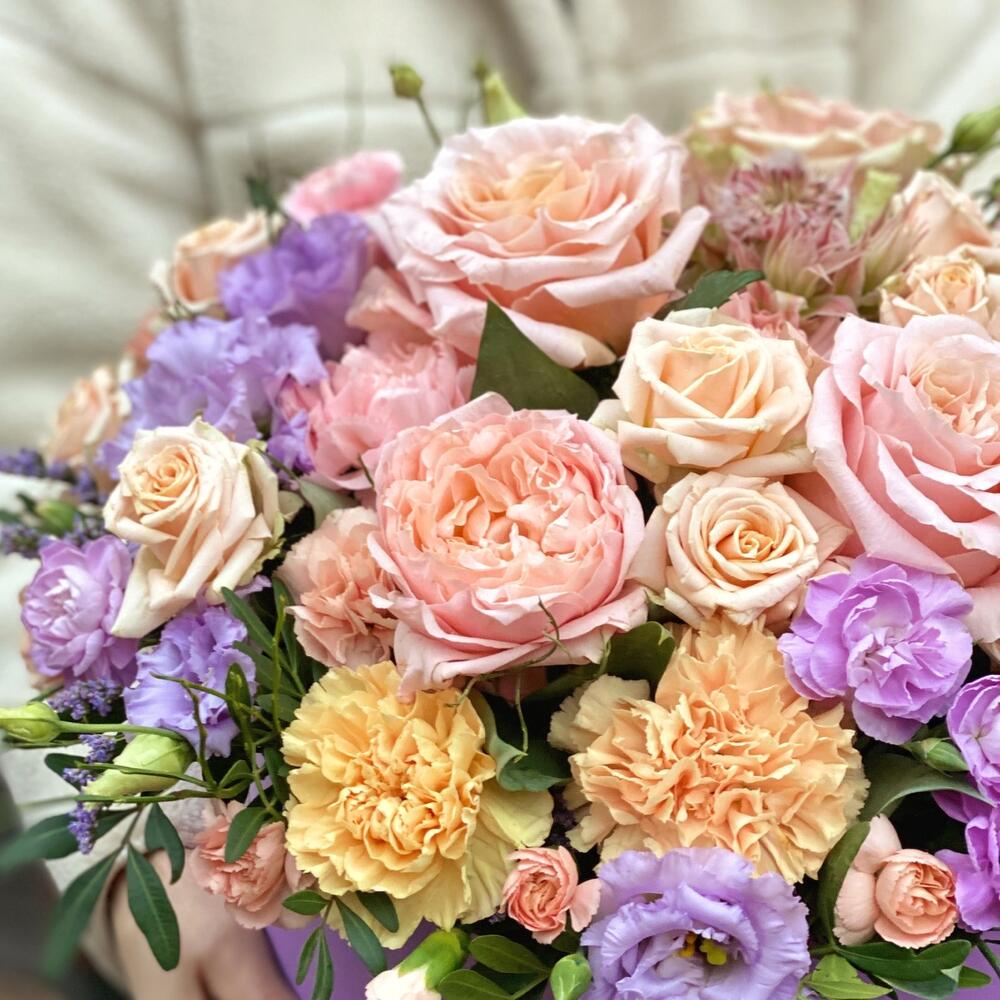 Альстромерии, Гвоздики, Кустовые розы, Лизиантусы, Розы, Хризантемы
