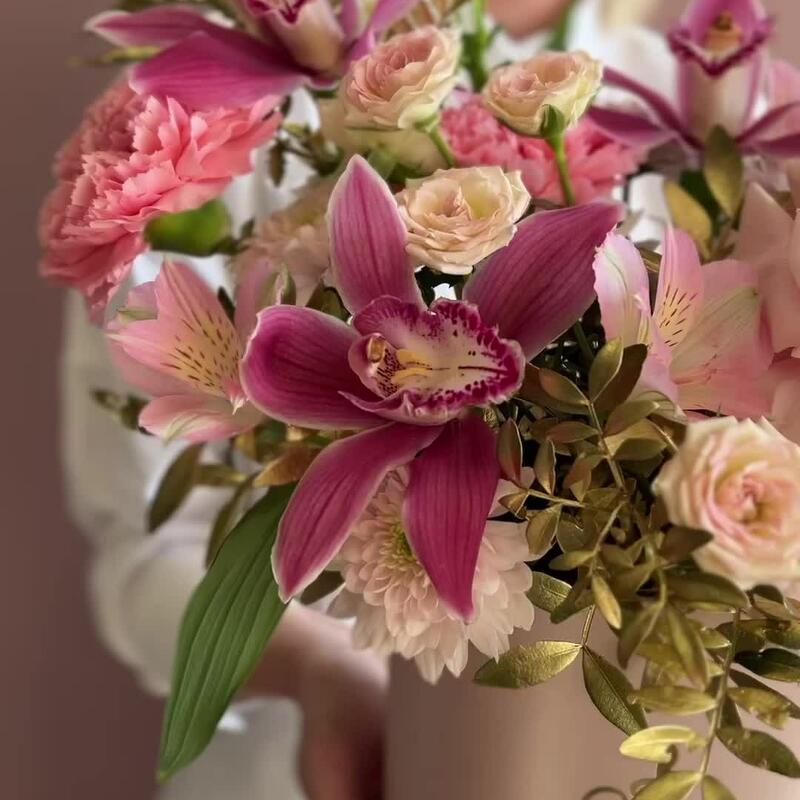 Альстромерия – 1 шт.Орхидея Цимбидиум – 3 шт.Папоротник – 1 шт.Роза кустовая – 1 шт.Хризантема кустовая – 1 шт.Гвоздика – 2 шт.Фисташка – 2 шт.Коробка брендированная – 1 шт.Роза пинк мондиаль – 1 шт.Губка флористическая – 1 шт.
