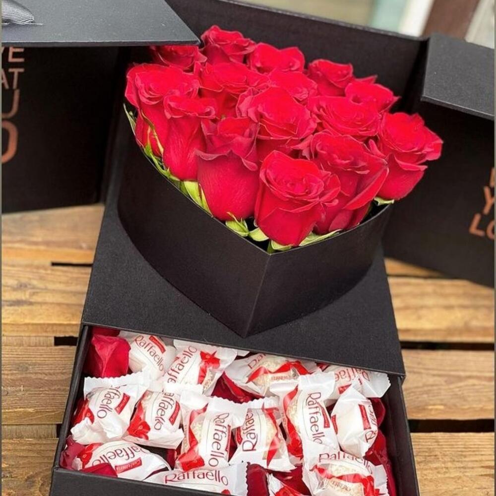 “Сладкое сердце ” – цветочная композиция с сладостями в коробке “Сердце”